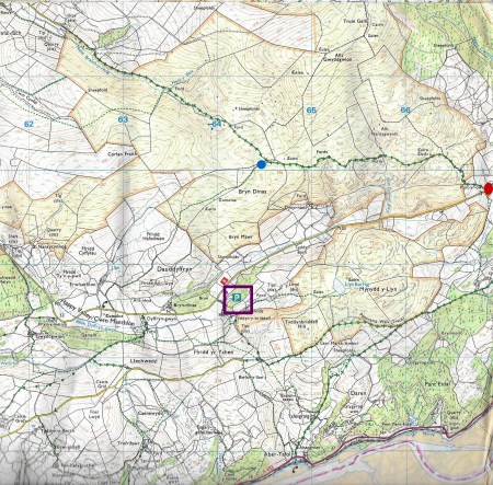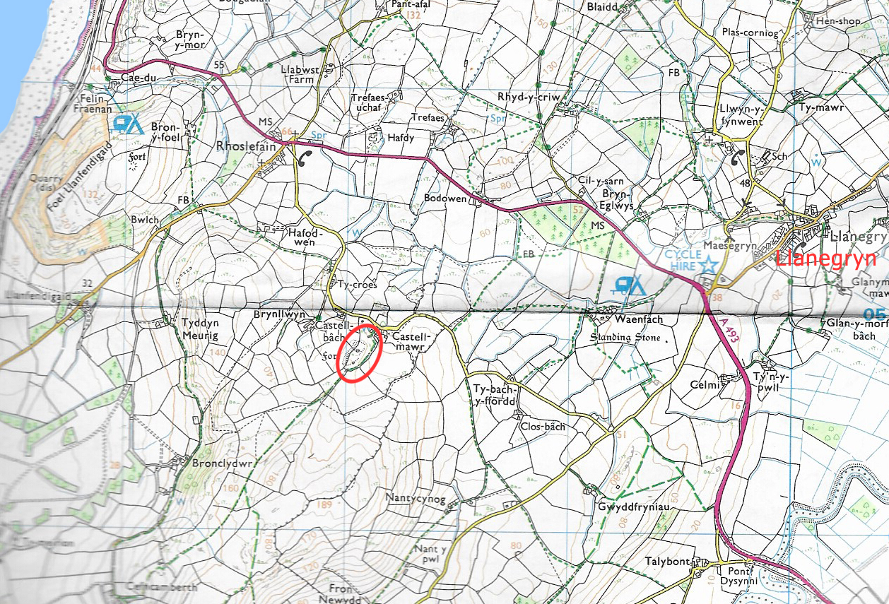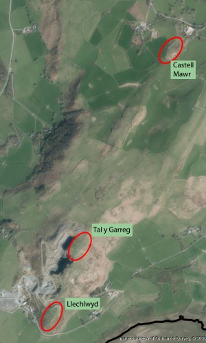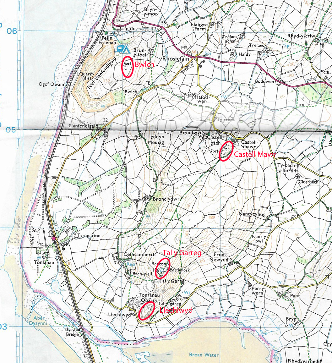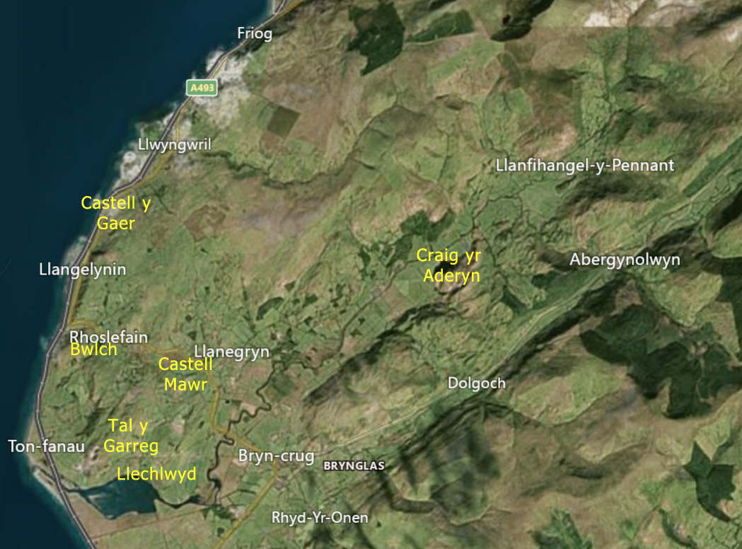 Craig yr Aderyn is one of a small number of hillforts that were built near the Dysynni valley.  I’ve already posted about the two small hillforts at the mouth of the Dysynni, Tal y Garreg and Llechlwyd on Mynydd Garreg above Tonfanau, some 8km away to the west of Craig yr Aderyn.  Nearer to Craig yr Aderyn is Castell Mawr, c.5.5km to the west as the crow flies, about which I have also posted.  See the map at the end of the post.