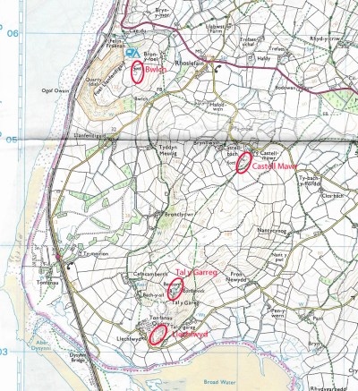 Map showing the known hillforts in the area (my annotations in yellow). Source of map: Archwilio