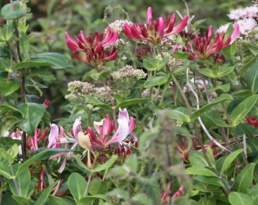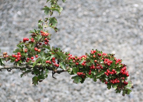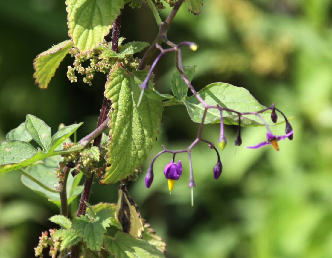 Bittersweet, or woody nightshade (Solanum dulcamara).  All parts of the plant are poisonous but in humans usually cause only upset stomachs. The latin species name “dulcamara” means sweet-bitter, which describes the bitter taste, followed by a sweet after-taste. In Germany physicians used it as a cure for rheumatism and it was hung around the necks of cattle to ward off evil. It flowers from June to September and is happy in hedgerows and woods. After flowering it produces egg-shaped berries that start off green, as above, and slowly become a bright, shiny red.