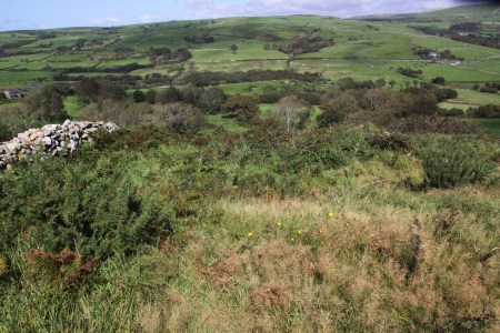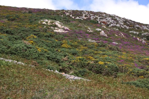 The approach is from the A493 coast road.  As you close on Llywgril from the south, there is a cemetery on the right, just before you reach the village itself, and a tiny, sharp right-hand turn in front of the cemetery.  The hillfort is about 3 minutes up the single-track road (driving slowly).  It is on private land, and there’s no public footpath, there are barriers to entry and the Heneb website states that the owner currently allows access, which is a generous courtesy.  I parked on the verge opposite.  The banks are liberally covered in gorse, but there are plenty of ways into the fort, including the original entrance at the far right as you look at it form the road.  Sheep tracks show that it is regularly visited by the local livestock, and they break through the gorse at a number of locations around the perimeter.