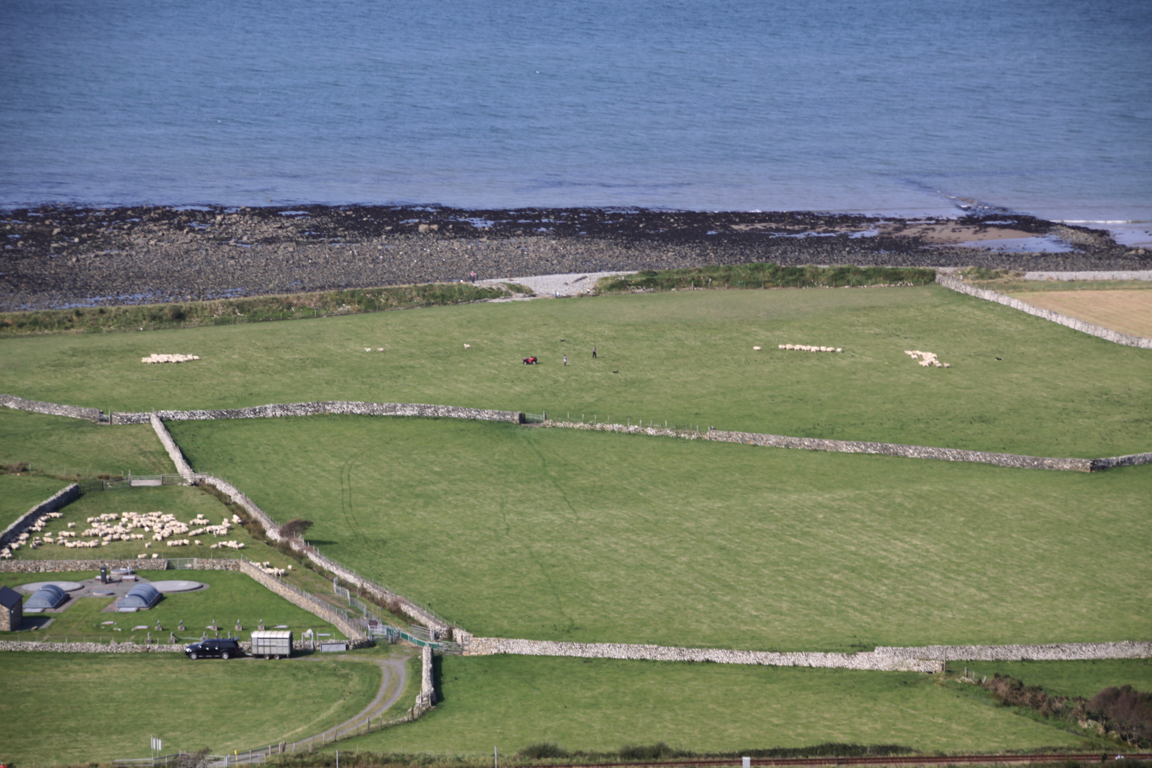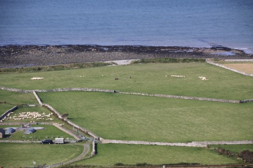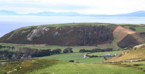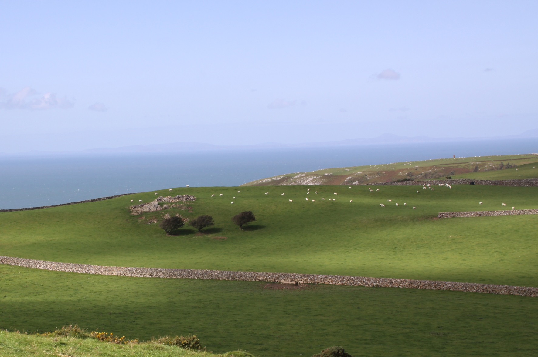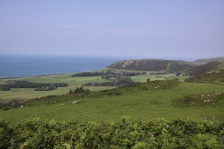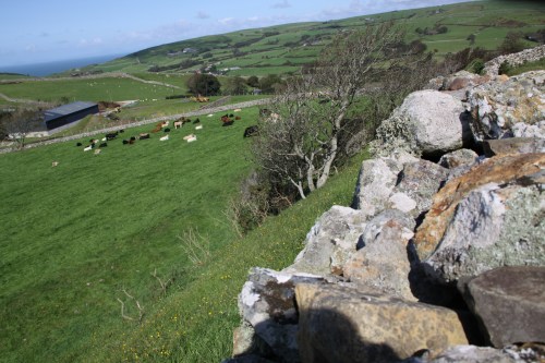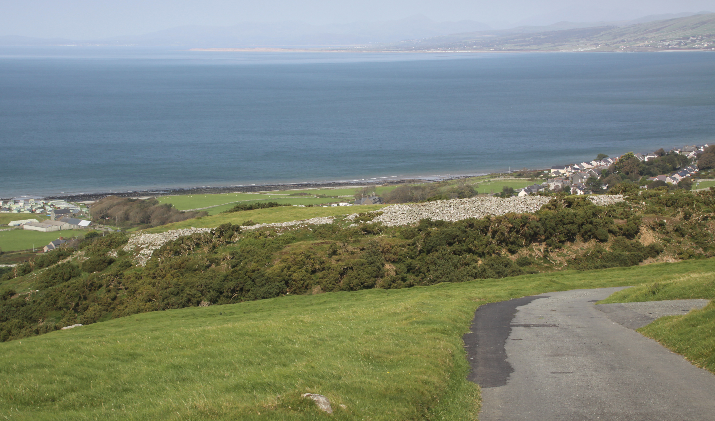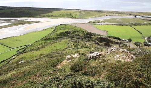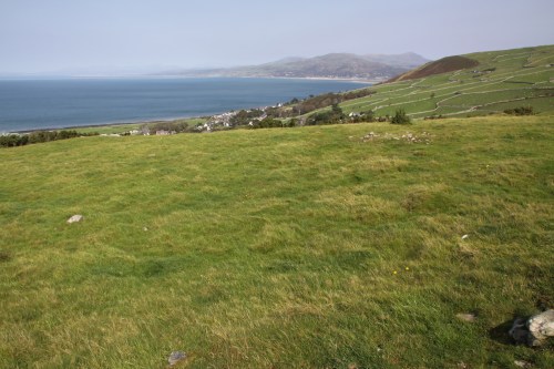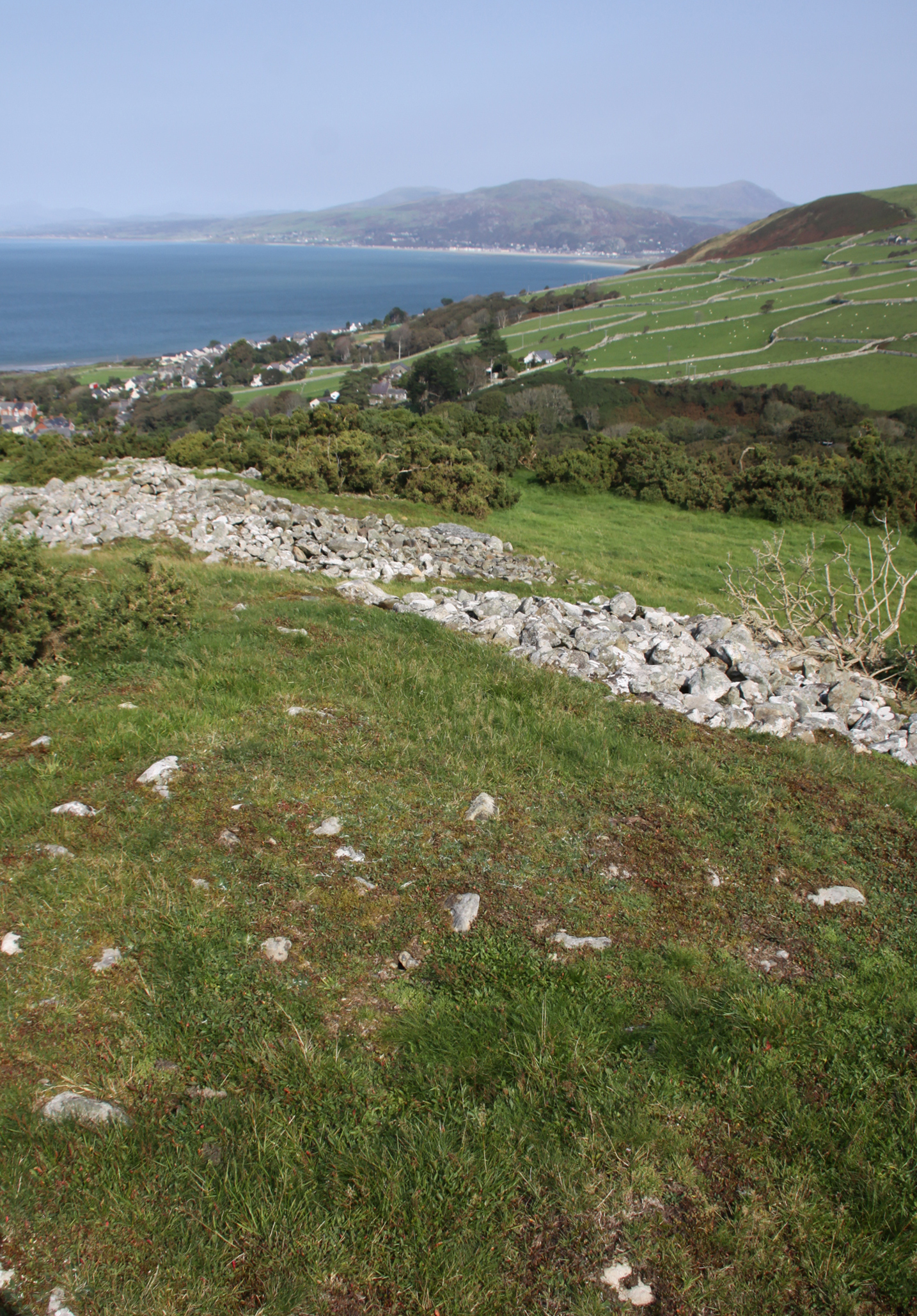The views are all about the coastline.  As well as the sea immediately to the west, the coastline is clearly visible all the way to Barmouth and the mouth of the Mawddach estuary to the north.  Immediately to the north, the inland view is over a nearby hillside, now a pattern of drystone walls.  The Lleyn Peninsula was visible in the far north as a blue silhouette.  Behind the fort, rising to the east and southeast, is lightly sloping hillside.  This drops fairly steeply to the southwest of the fort in a line with the hillside beneath the fort itself.   The slope flattens gradually towards the sea, and both the hill and the fields below are grazed today by sheep at all levels and cattle on the lower levels.  To the south, pastures look out to the sea.