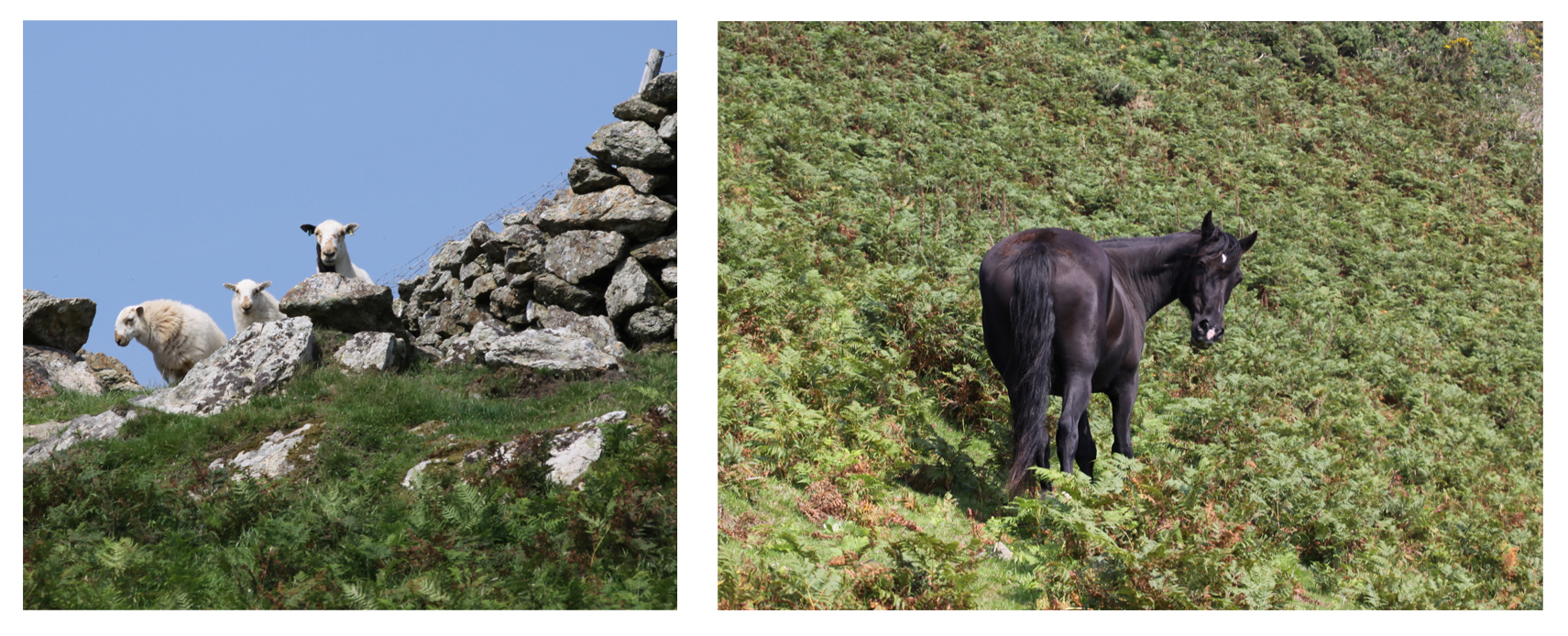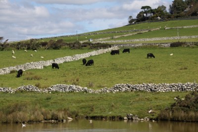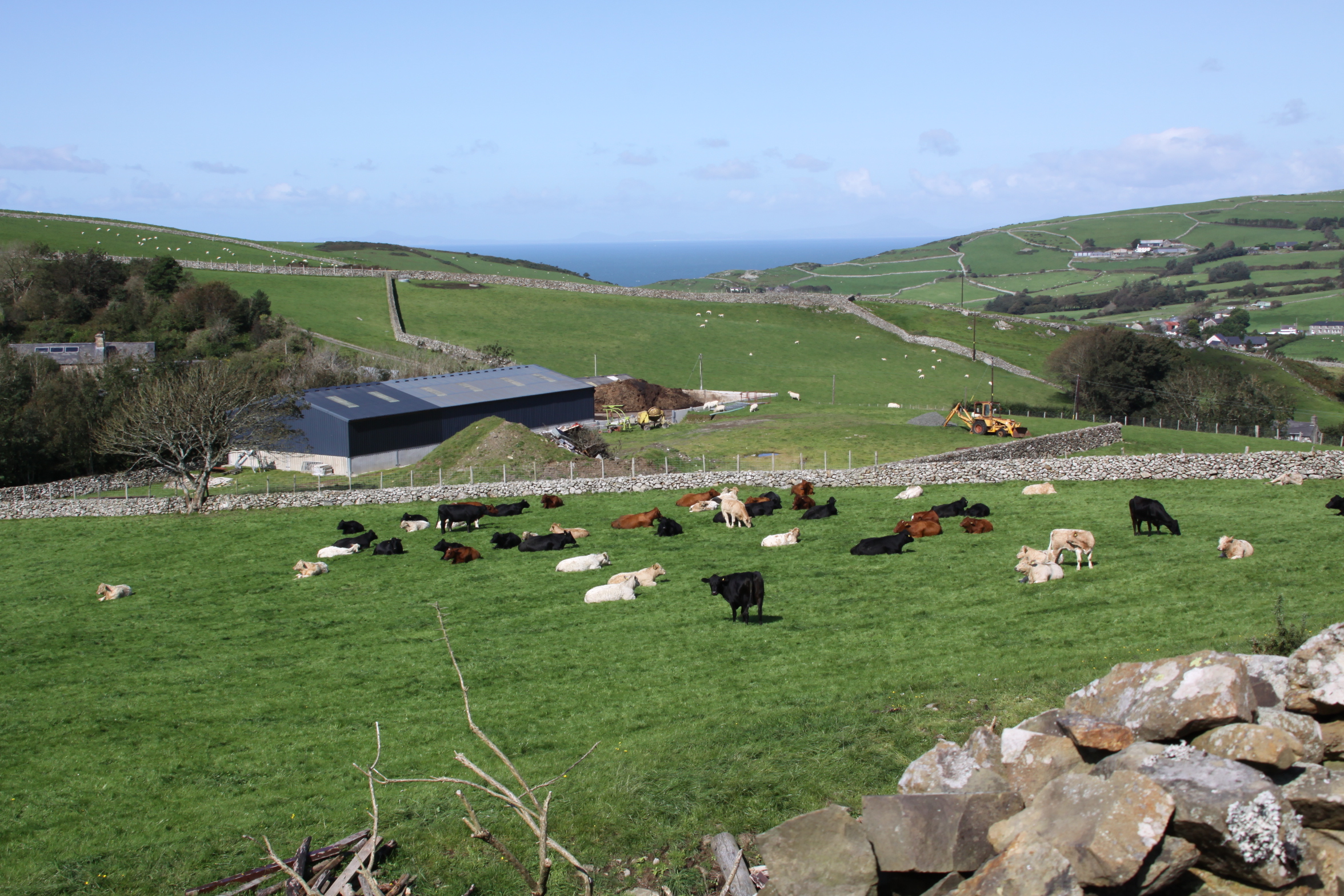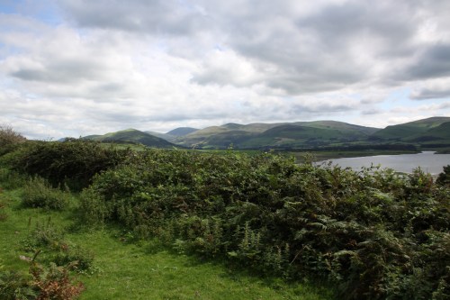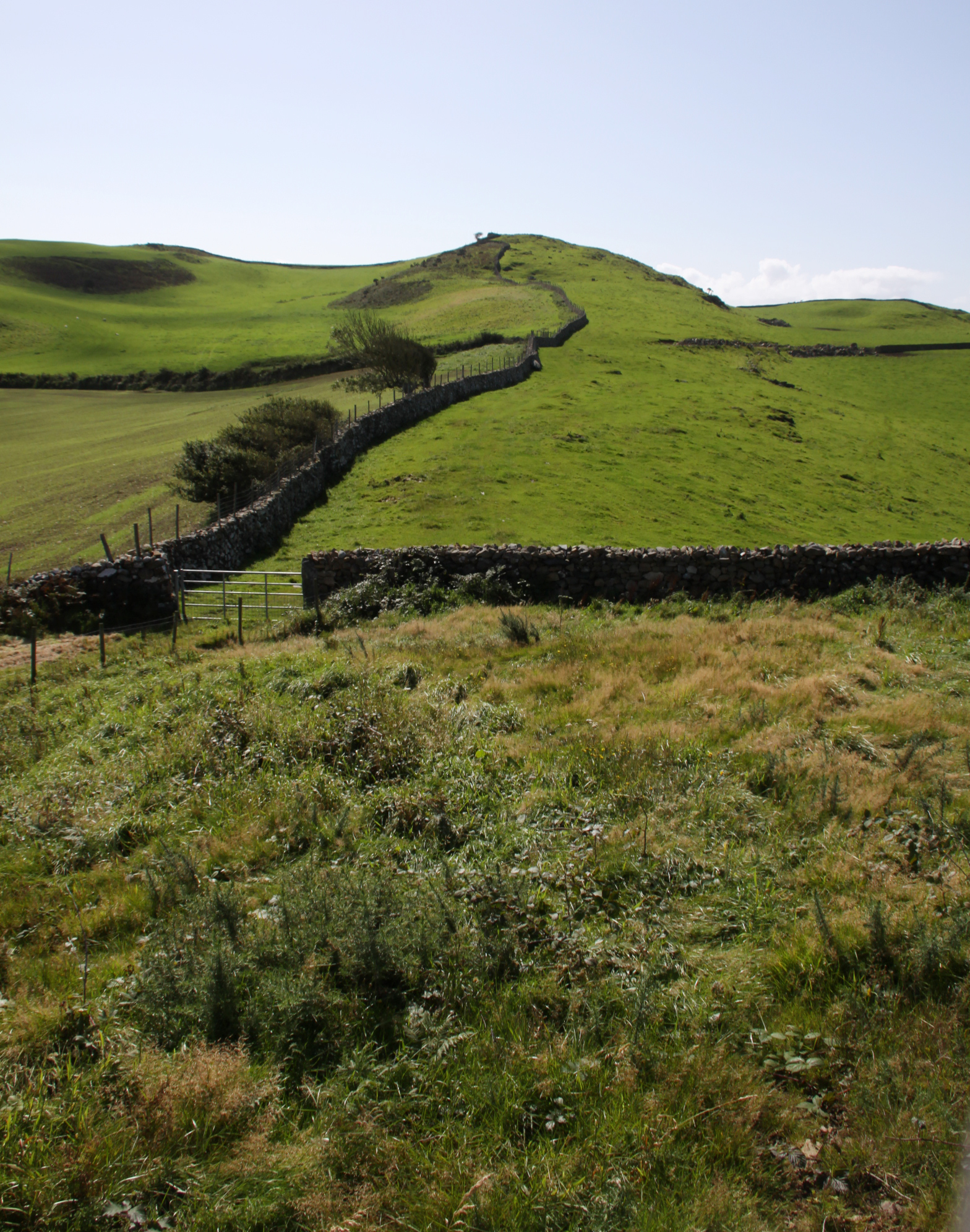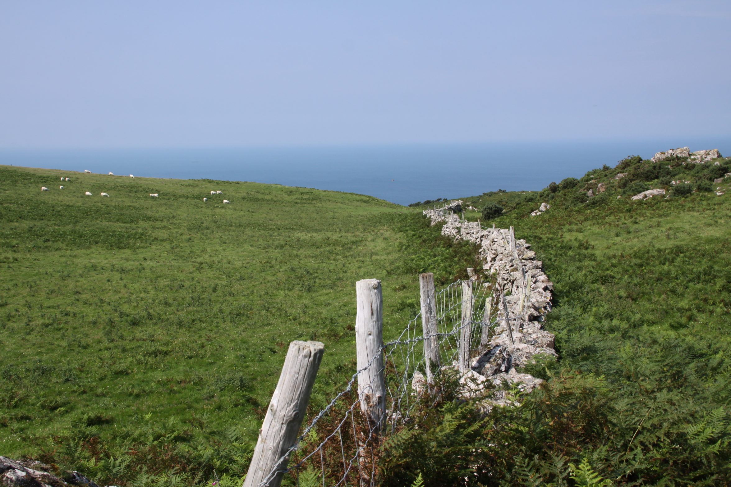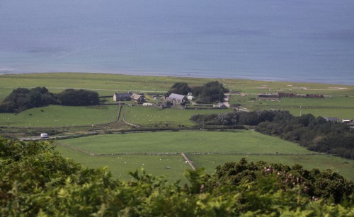 The views are all about the coastline.  As well as the sea immediately to the west, the coastline is clearly visible all the way to Barmouth and the mouth of the Mawddach estuary to the north.  Immediately to the north, the inland view is over a nearby hillside, now a pattern of drystone walls.  The Lleyn Peninsula was visible in the far north as a blue silhouette.  Behind the fort, rising to the east and southeast, is lightly sloping hillside.  This drops fairly steeply to the southwest of the fort in a line with the hillside beneath the fort itself.   The slope flattens gradually towards the sea, and both the hill and the fields below are grazed today by sheep at all levels and cattle on the lower levels.  To the south, pastures look out to the sea.
