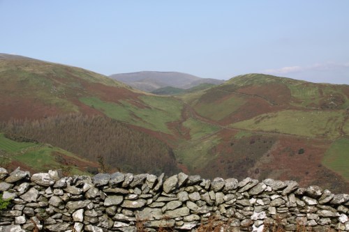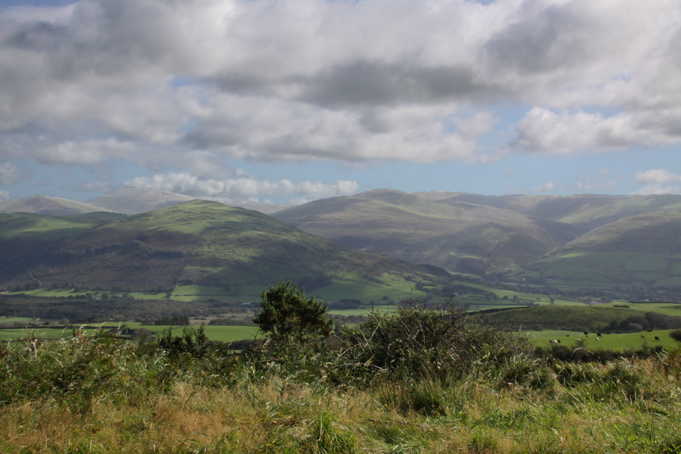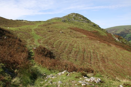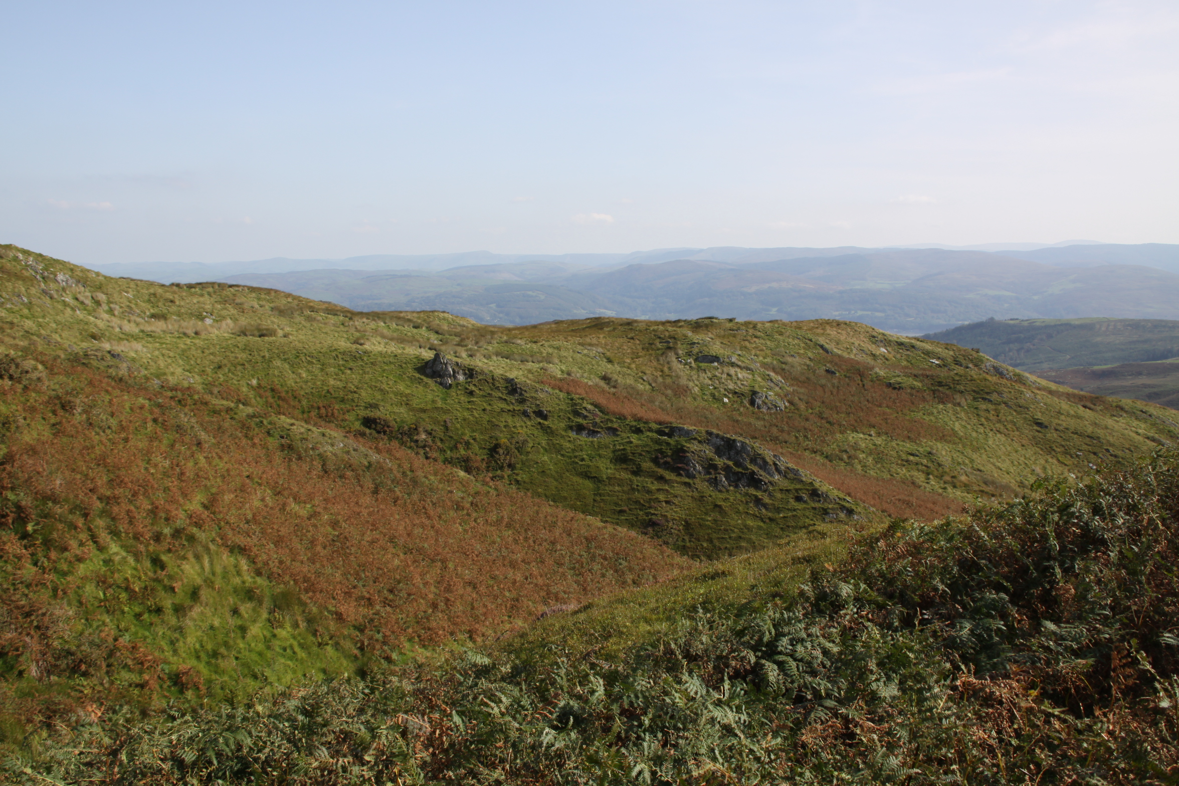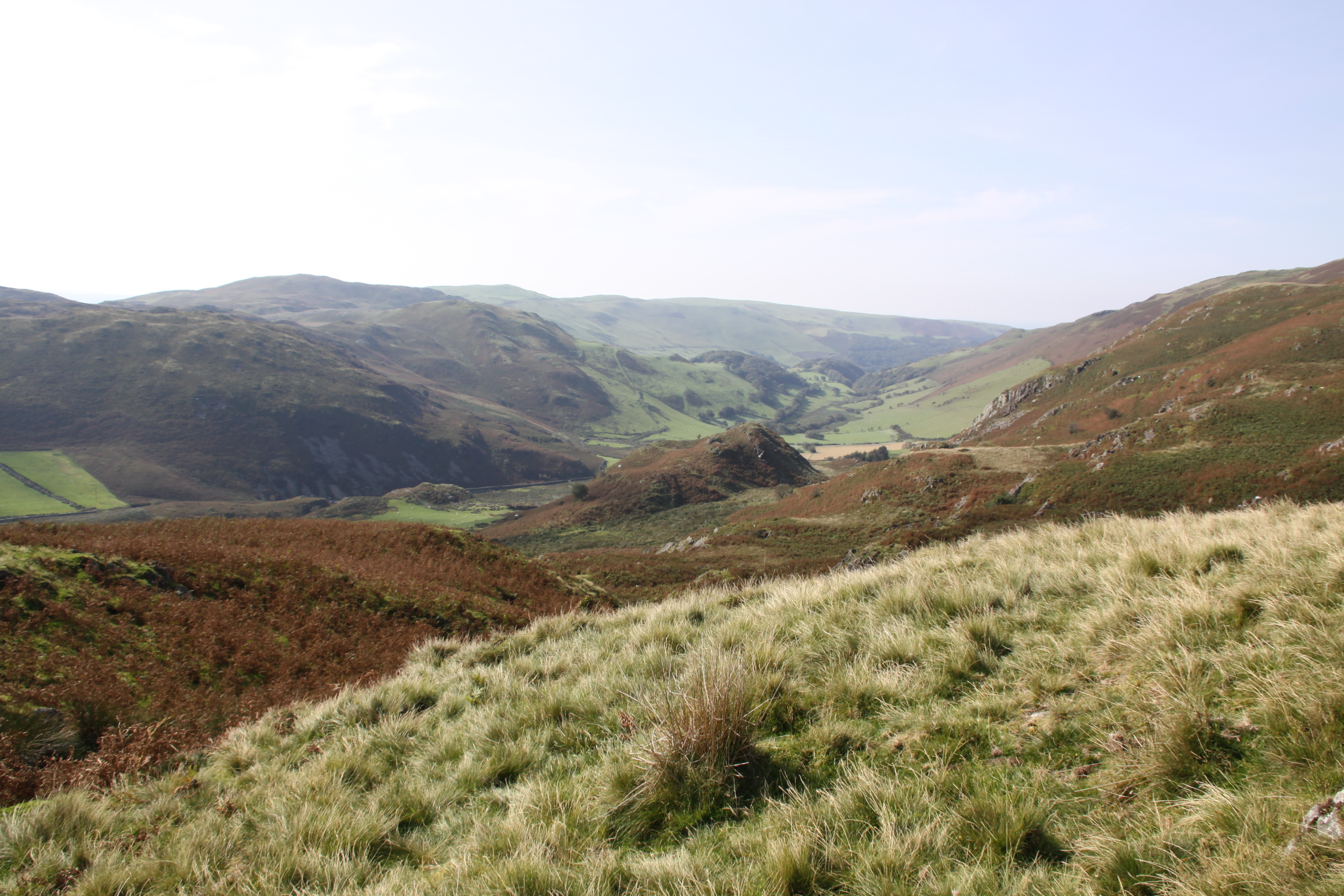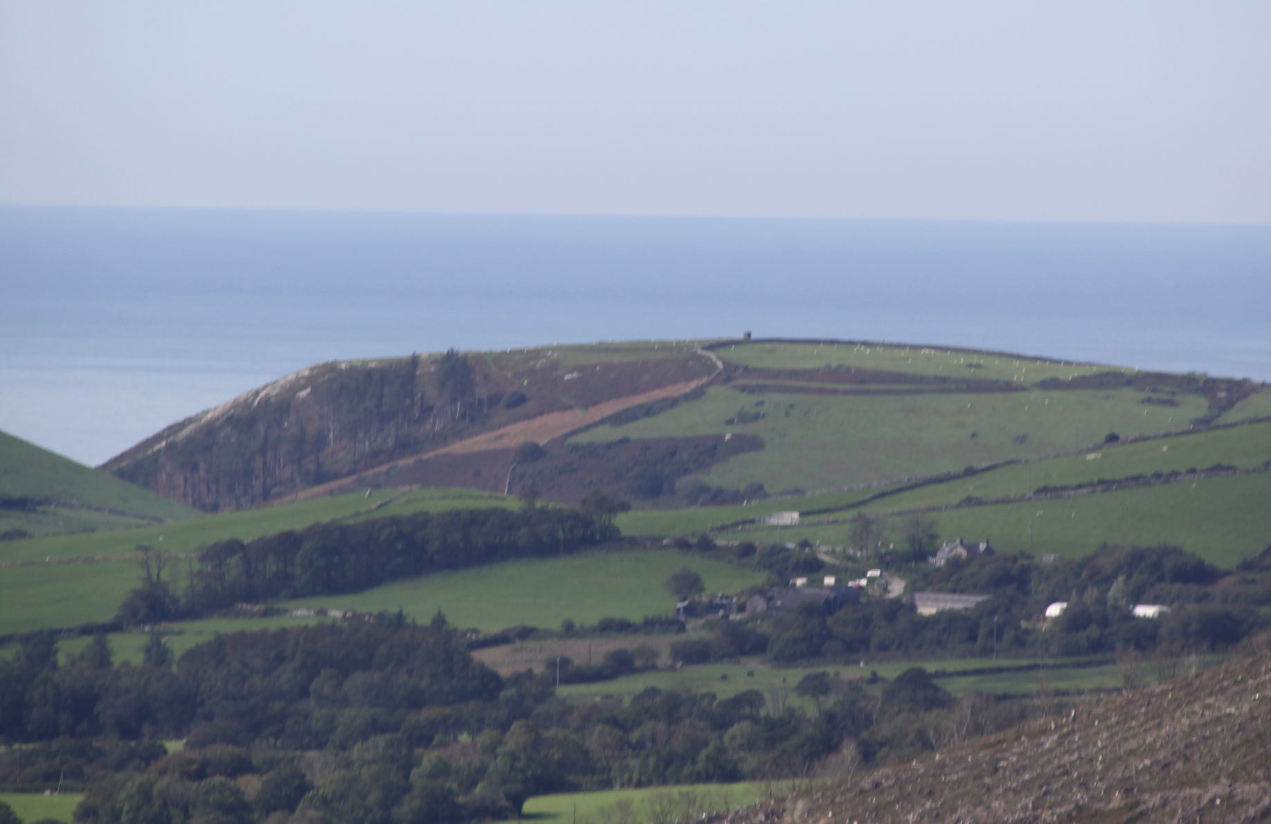The location of the site is commanding.  It is c.9 km inland and therefore although the sea is visible, it has no view over the comings and goings of anything that was travelling along the coast.  If it was in league with any or all of the Tal y Garreg, Llechlwyd or Castell Mawr hillforts, that may not have been important.  What it did have, and still does, is  remarkable views over the Dysynni valley to the west and east from the summit, and good views towards the hill slopes to the north and south.   It is lower than many of the surrounding hills to north and south, but difficult to reach except via the saddle connecting it to the main hillside to its north.