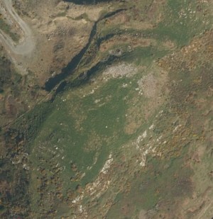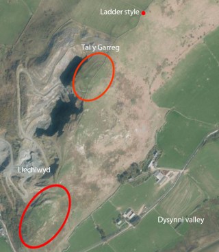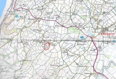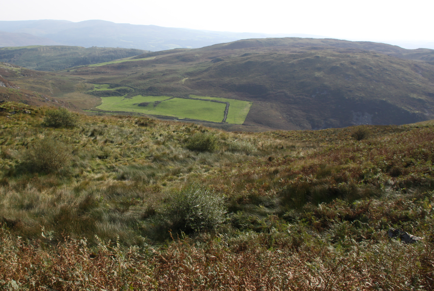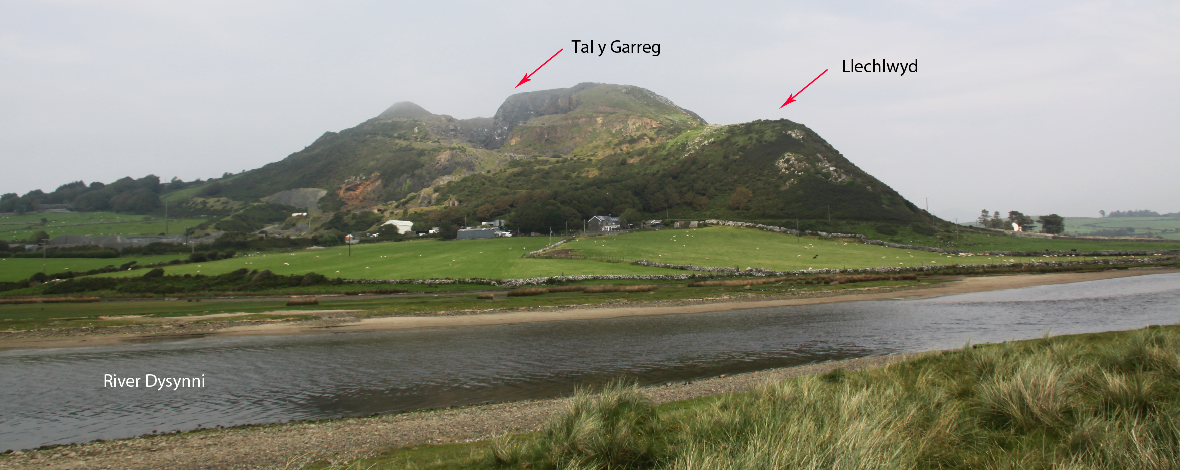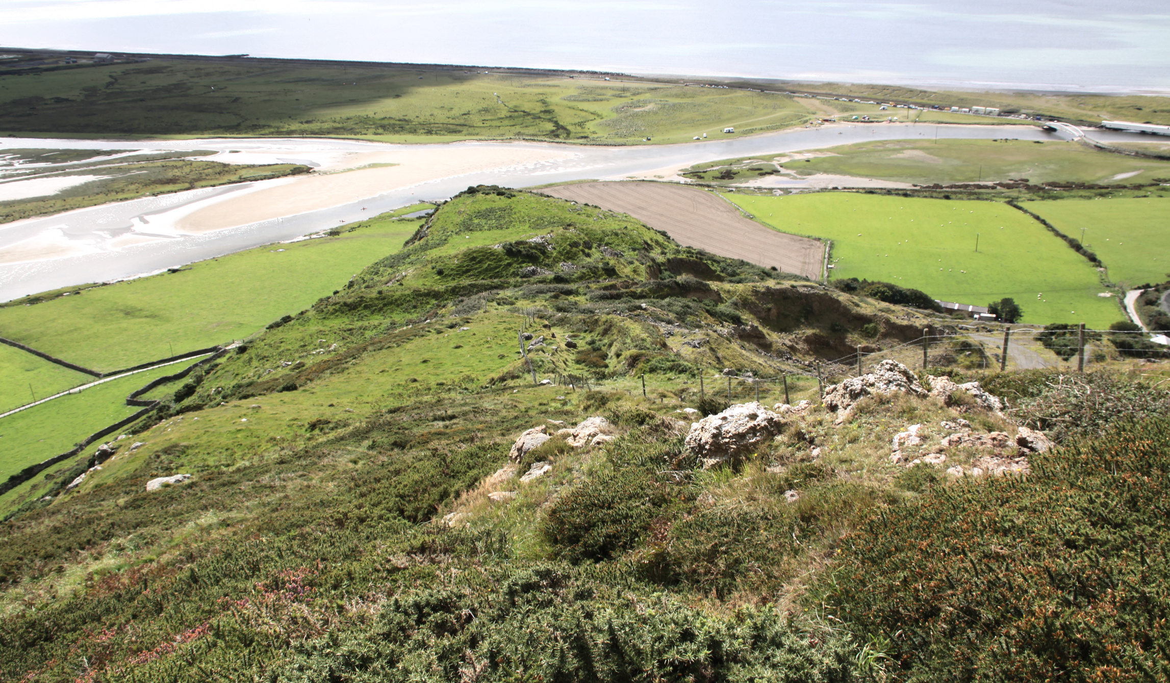Craig yr Aderyn, which translates as Rock of Birds, or more usually Bird Rock, is a major local landmark, abutting the of the Foel Wyllt hill ridge overlooking the Dysynni valley from the south. The course and character of the river Dysynni have changed over time.  Before the 18th century the estuary reached almost to the foot of Craig yr Aderyn, but the river silted up and is no longer navigable.  The land has been drained since the 1700s to create better quality land for farming, although standing looking down from the summit, it is quite clear that the land to the west still has some very boggy patches marked by beds of spiny rush (Juncus acutus), which is found in all freshwater flats, bogs and marshes herabouts.  It is not known what it looked like in prehistory, but the presence of a glacial valley with Cadair Idris at its back indicates that a melt-water river certainly passed Craig yr Aderyn on its way to the sea, and this will have established a valley route into which later hill drainage descended.  It would be useful to know what it was like during the Iron Age.