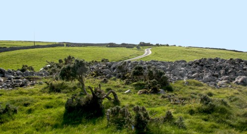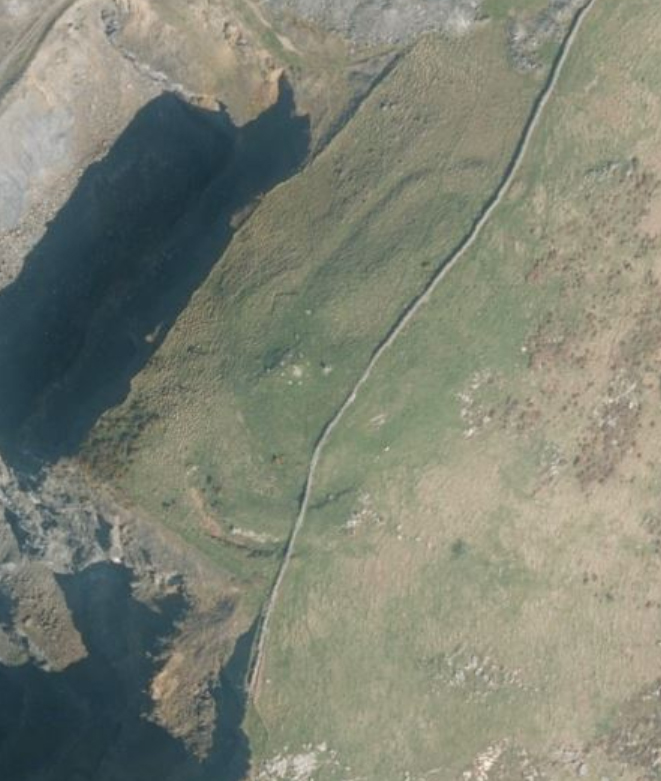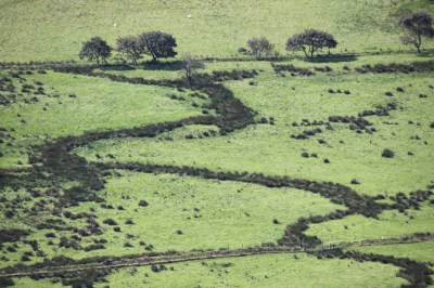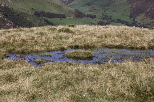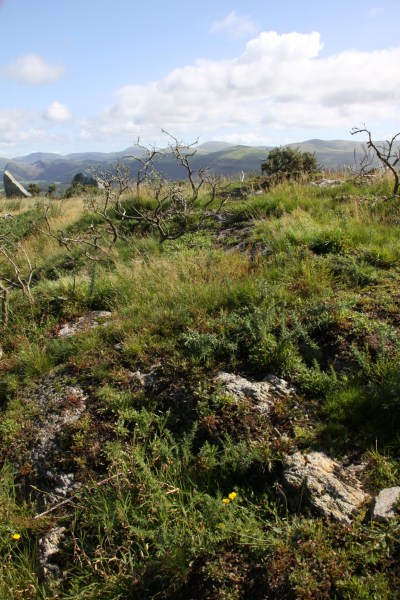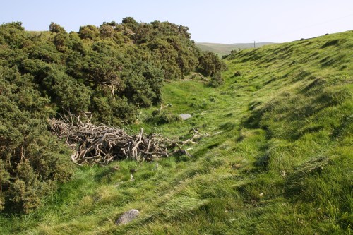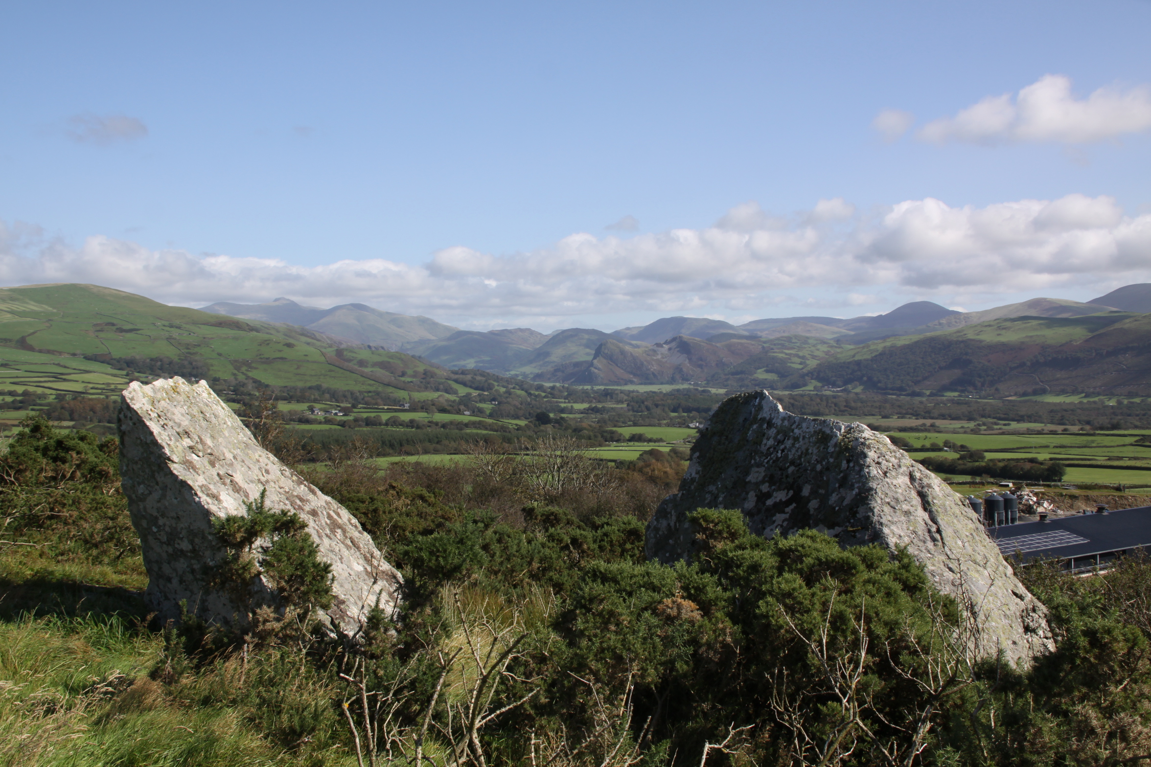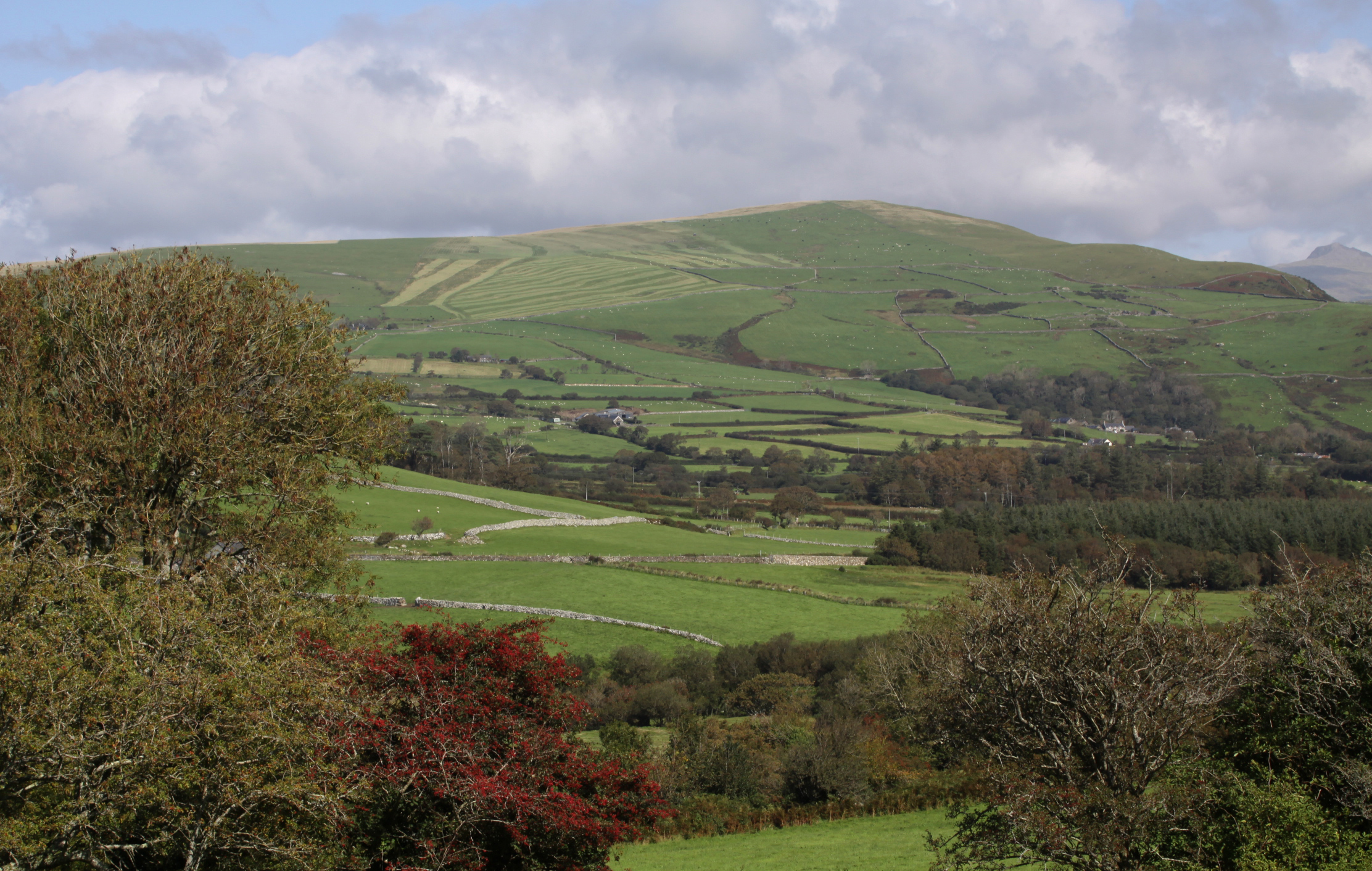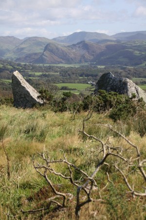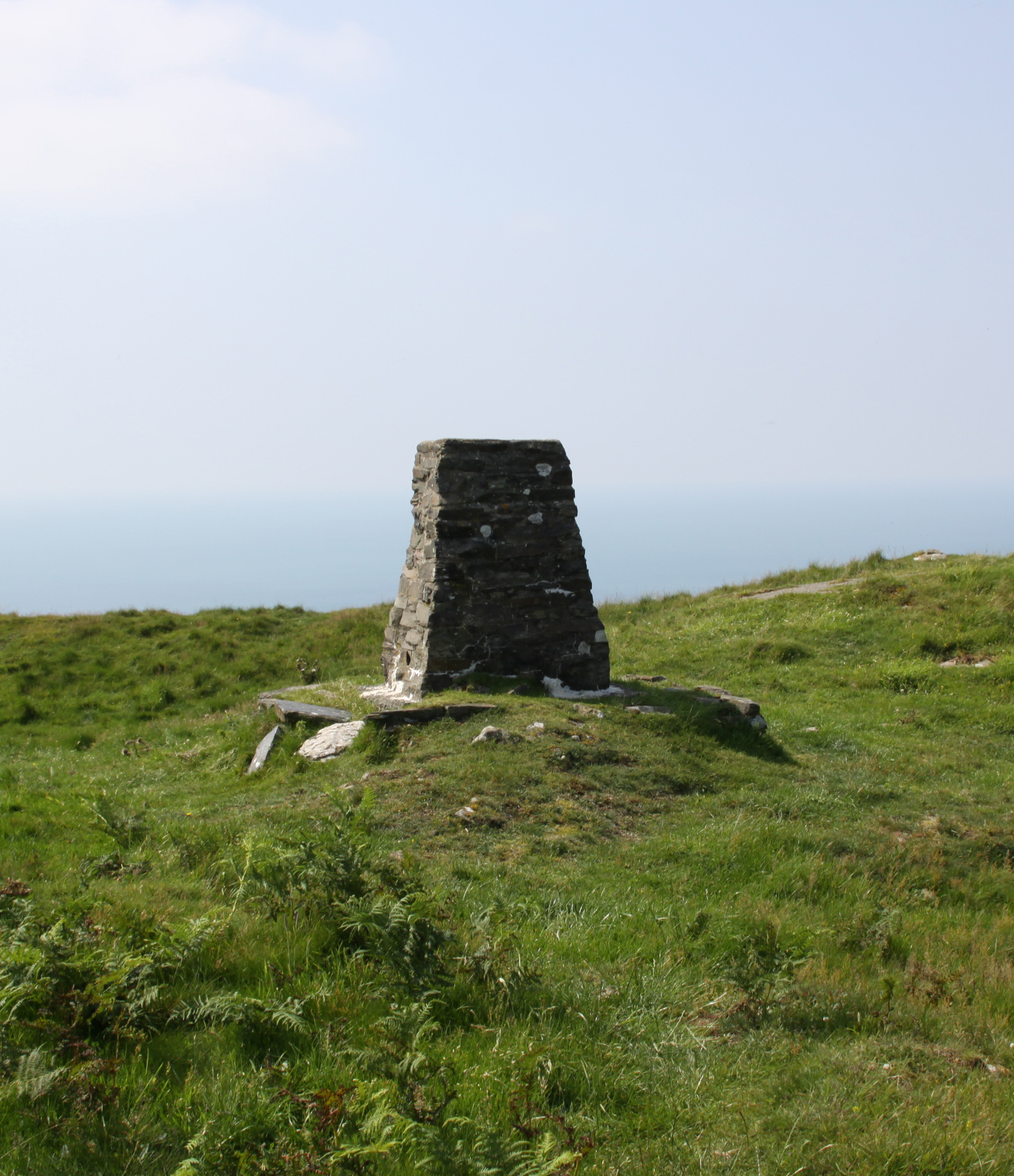 Craig yr Aderyn, which translates as Rock of Birds, or more usually Bird Rock, is a major local landmark, abutting the of the Foel Wyllt hill ridge overlooking the Dysynni valley from the south. The course and character of the river Dysynni have changed over time.  Before the 18th century the estuary reached almost to the foot of Craig yr Aderyn, but the river silted up and is no longer navigable.  The land has been drained since the 1700s to create better quality land for farming, although standing looking down from the summit, it is quite clear that the land to the west still has some very boggy patches marked by beds of spiny rush (Juncus acutus), which is found in all freshwater flats, bogs and marshes herabouts.  It is not known what it looked like in prehistory, but the presence of a glacial valley with Cadair Idris at its back indicates that a melt-water river certainly passed Craig yr Aderyn on its way to the sea, and this will have established a valley route into which later hill drainage descended.  It would be useful to know what it was like during the Iron Age.