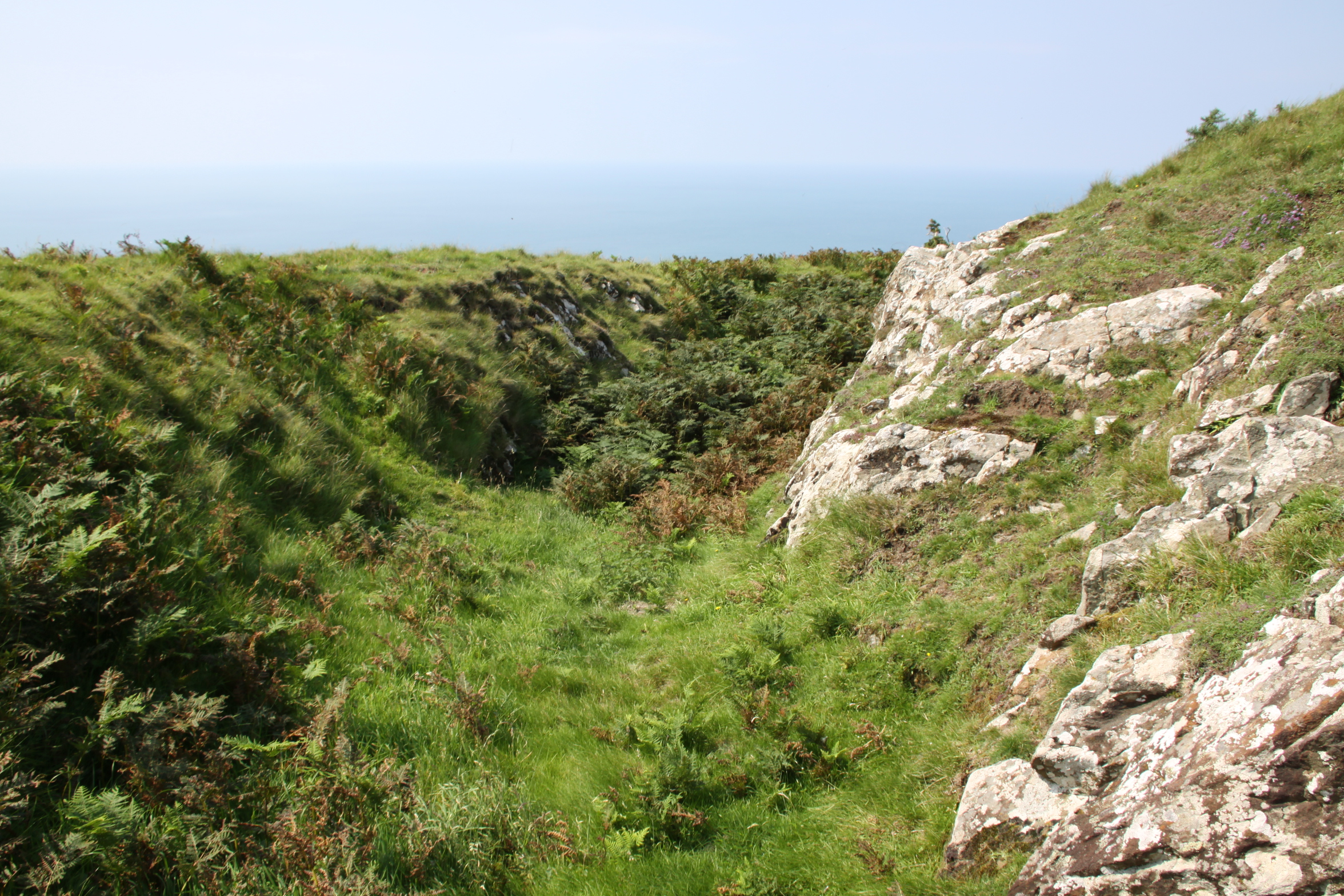At Craig yr Aderyn all of the hillfort construction work took place on a natural shelf beneath the rocky peak, which the hillfort incorporates.  Its man-made defenses consist of two phases of earthen and stone banks.  Today the fort’s ramparts are covered in grass, but most of them are still clearly visible, although it took me some time to trace them against the site plan on the ground.  Thankfully they are covered mainly with short turf rather than bracken or long grass, which makes the job much easier than at places like Castell Mawr.  The ramparts are impressive, and served to cut off the only realistic line of human access to the hillfort, as the other side is a sheer drop into the valley beyond from the summit of Craig yr Aderyn, some 270m below.  The combination of natural and stone-faced sloping man-made defenses makes this one of the most ostentations structures of this type in the area.  The site is thought to have been built in two phases.