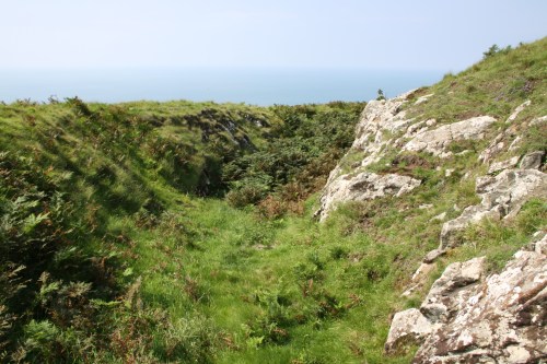 Castell-y-Gaer is quite different from most of the hillforts described so far.  Well preserved, it overlooks the sea but is not on the peak of the hill.  Although it seems high from below, which it is at just above the 120m OD contour line, it only has that drop on its western side.  It is on a slight knoll, very slightly tipped towards the sea to the northwest, a slope dropping fairly steeply away beneath it, running into pasture below.  The land around it on three sides, however, is fairly level and it is overlooked by higher ground on the same hill.  If it was not for the defenses, would present no difficulty to anyone attempting to enter it.