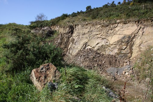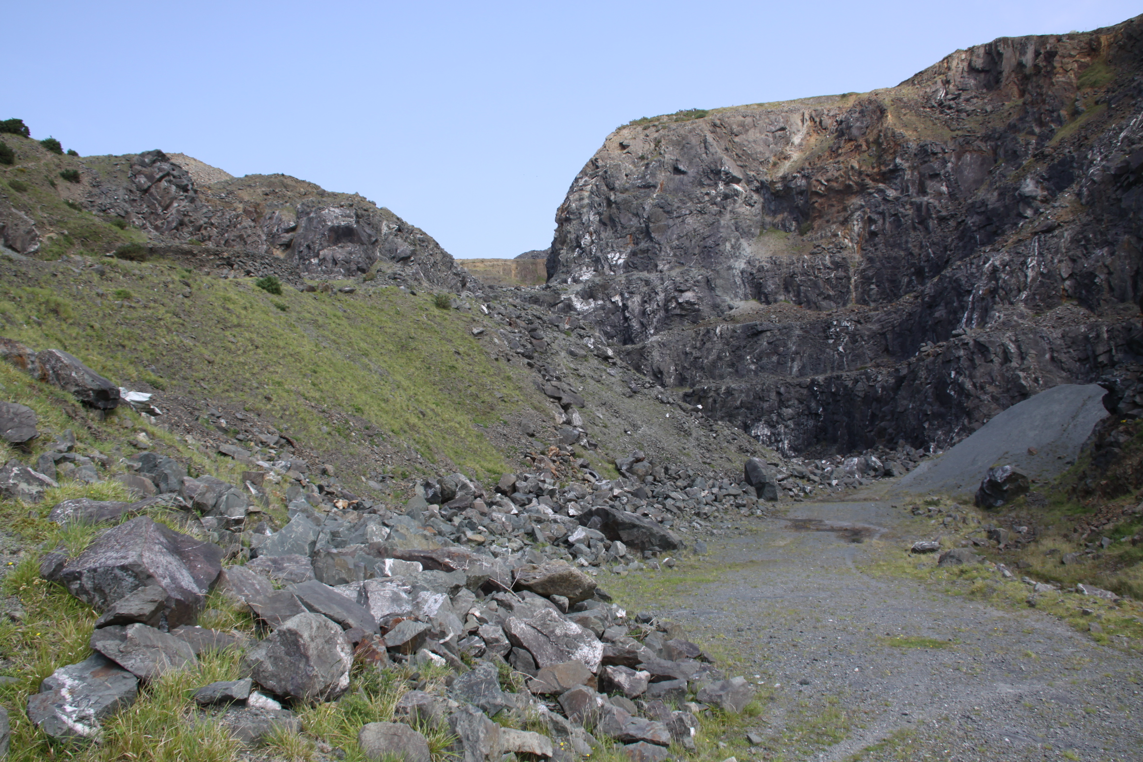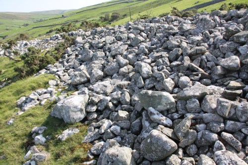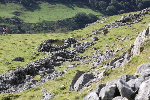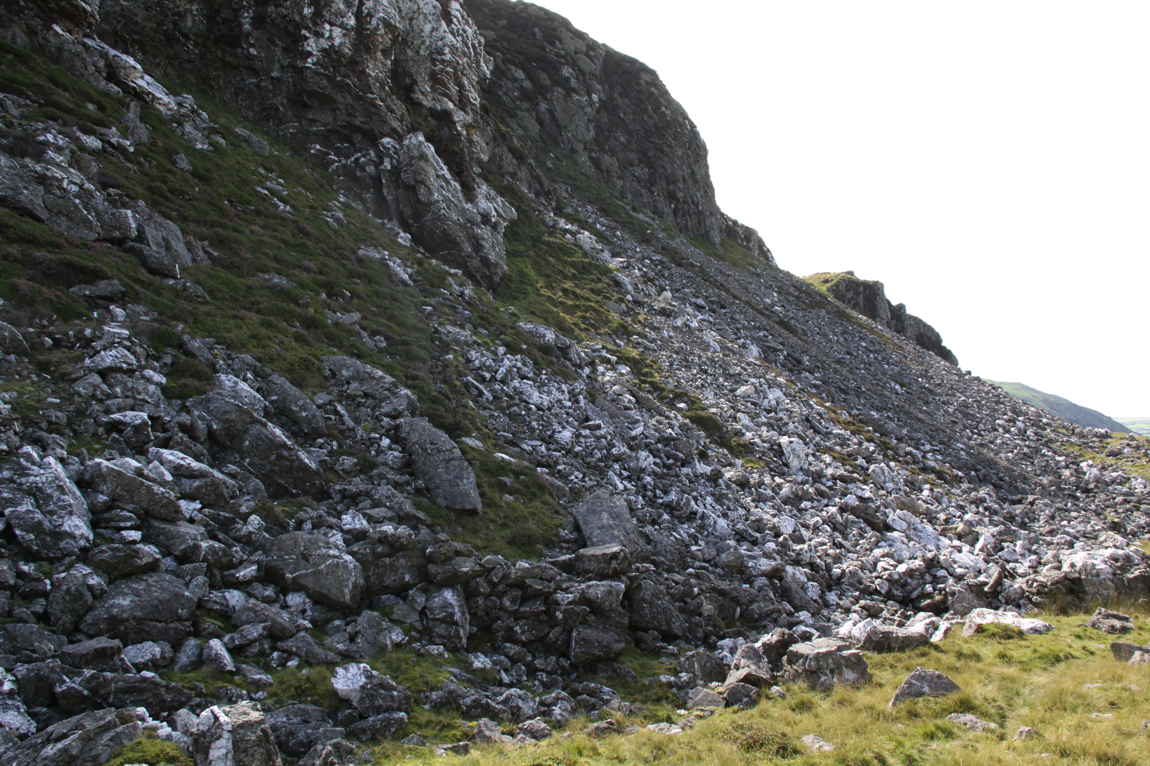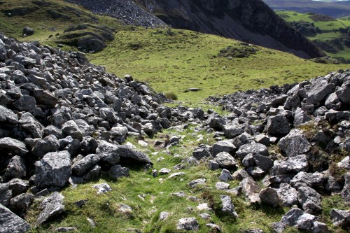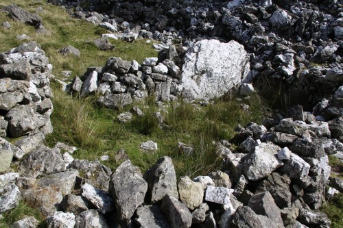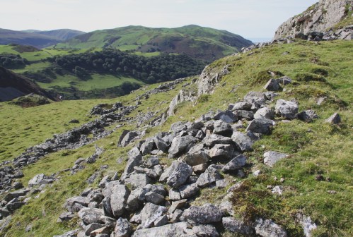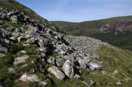 If there was insufficient stone for the facing from digging out the ditches, there was plenty of loose stone available for the ramparts.  Nearby rockfalls from the hill behind Craig yr Aderyn would have done the trick, and it is quite likely that those prominent today were the result of glacial activity.  The rocks in the immediate area were much bigger than any of those used for the stone facing, so they were probably broken up.  Interestingly, much of that rock is quartzite, some of it quite massive, but none of that was used in the rampart facing.  This suggests that the builders had a very specific vision, and it didn’t include quartzite.