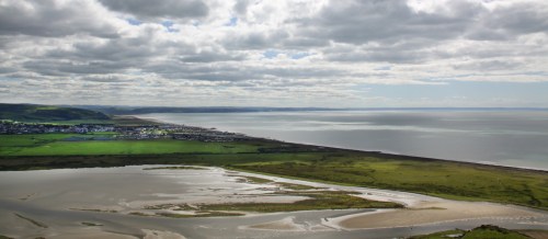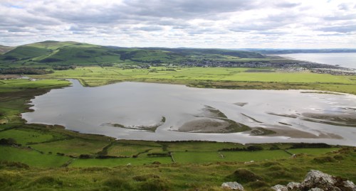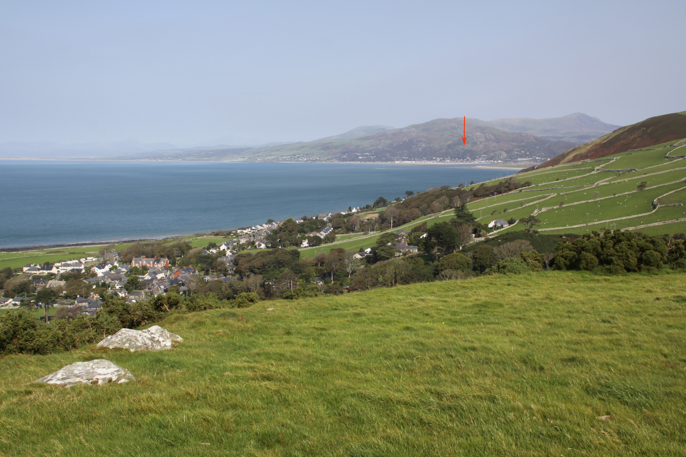 View towards Barmouth, the Mawddach estuary and Dinas Oleu (approximate location marked with a red arrow)