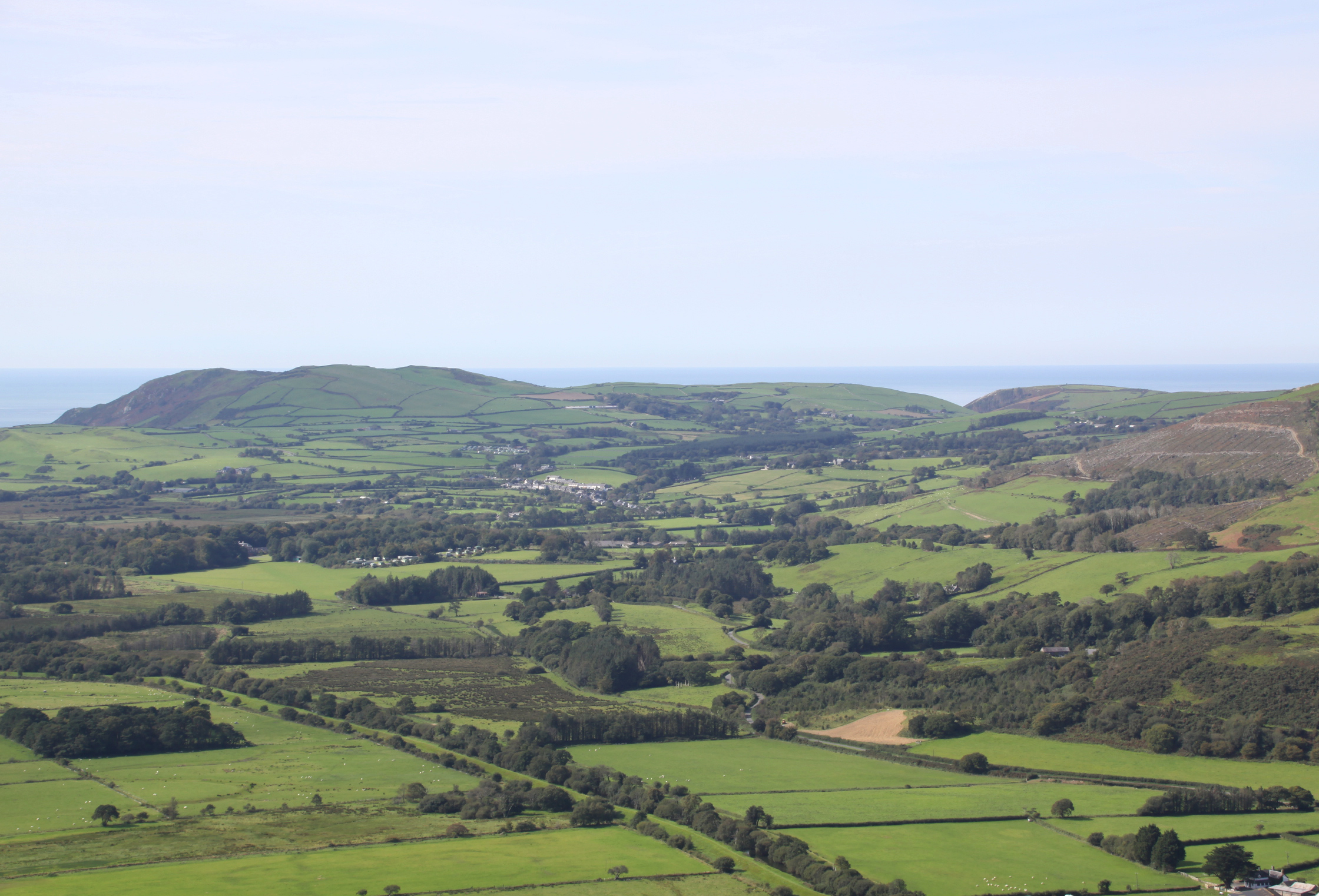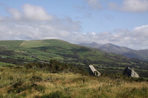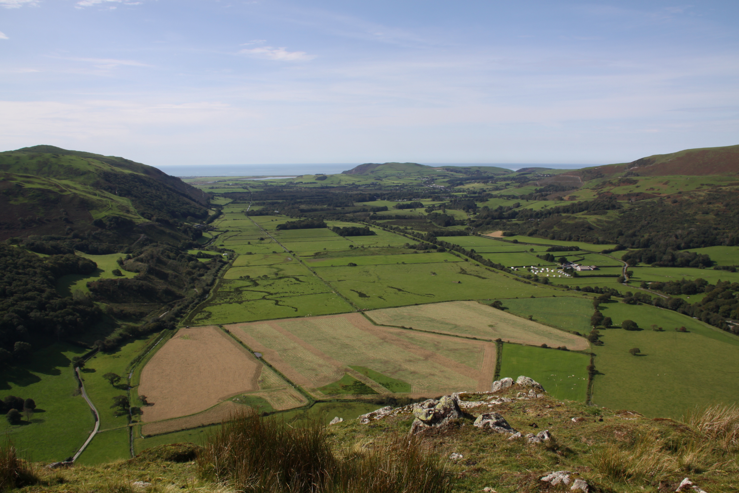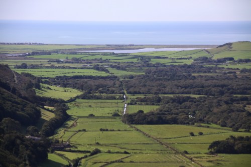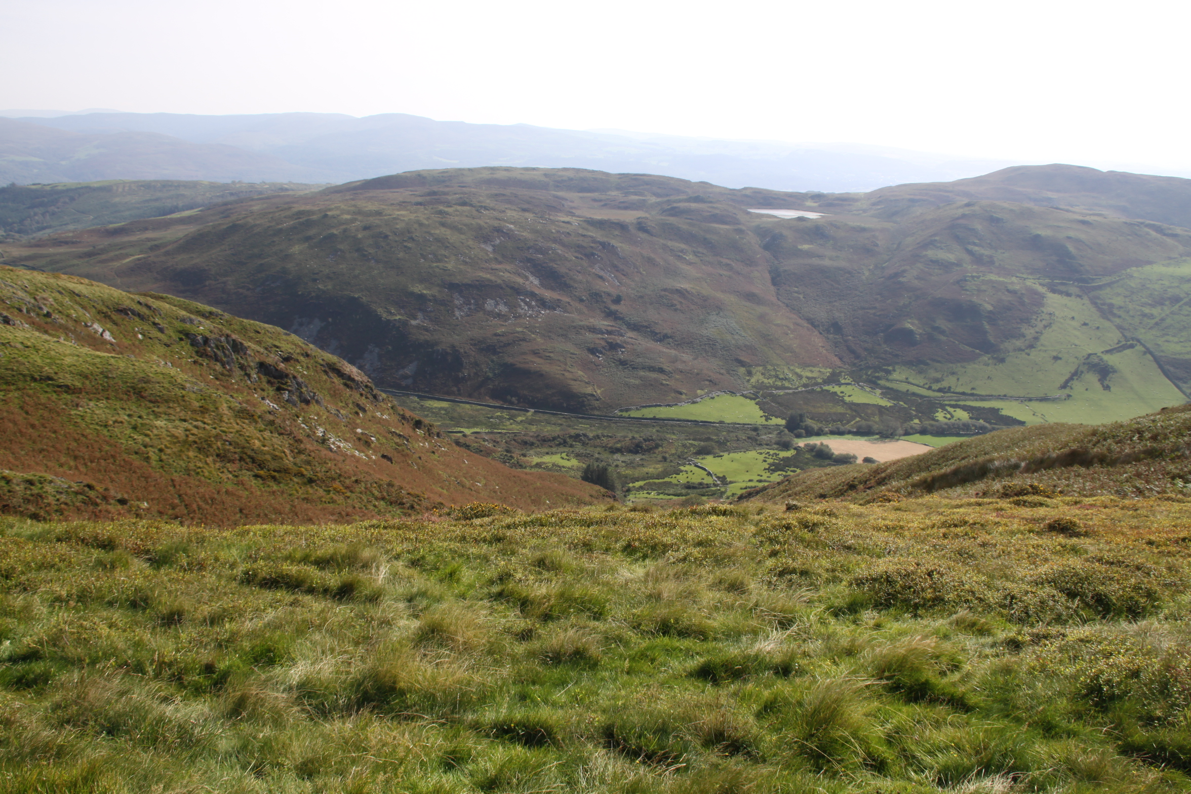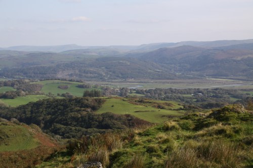 The ridge at the left of the photograph, at the end of the Dysynni valley is Mynydd Garreg. Llechlwyd and Tal y Garreg hillforts are at the coastal end, and Castell Mawr at the opposite end of the ridge. Bwlch is also visible at far right. Views from Craig yr Aderyn