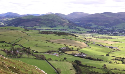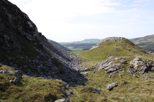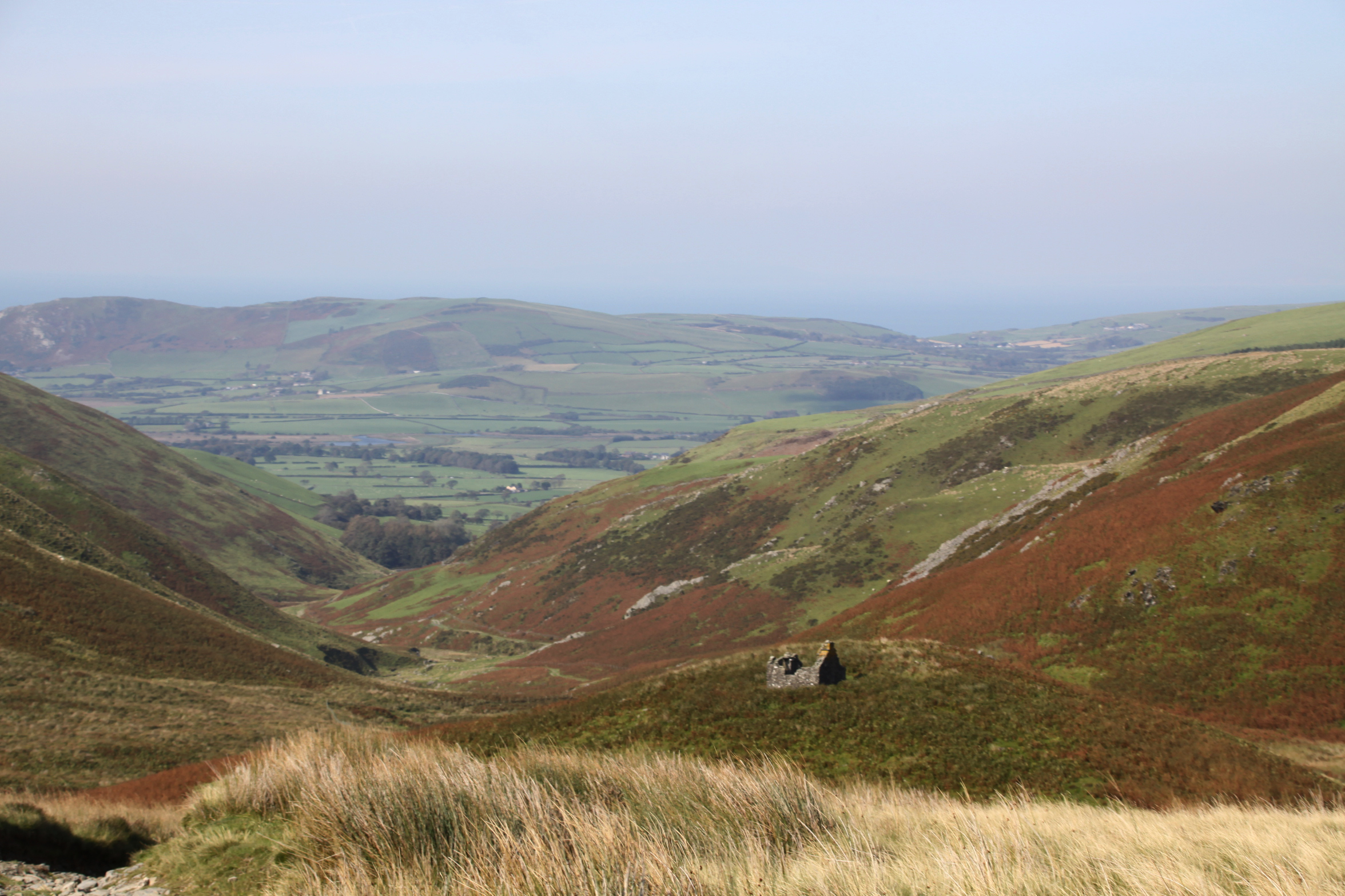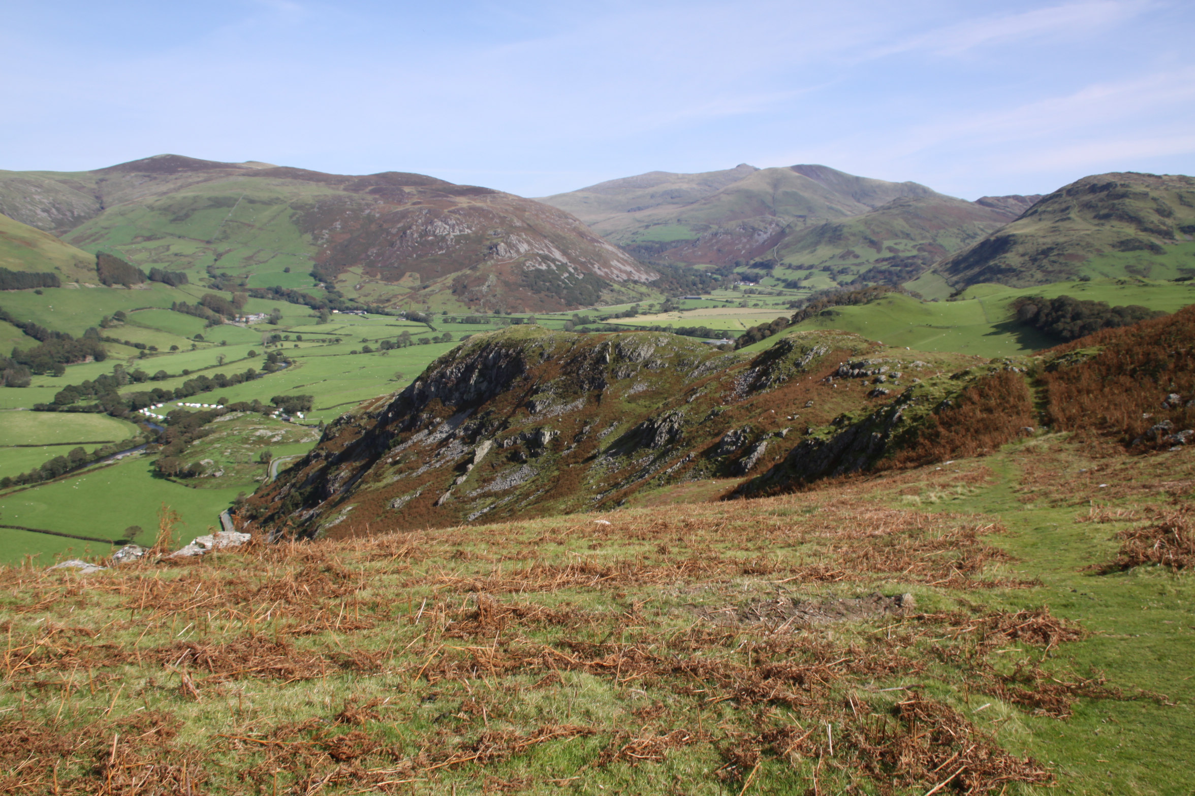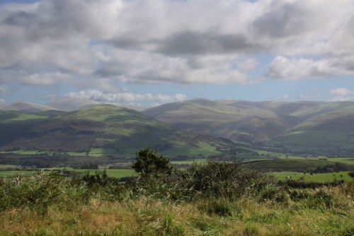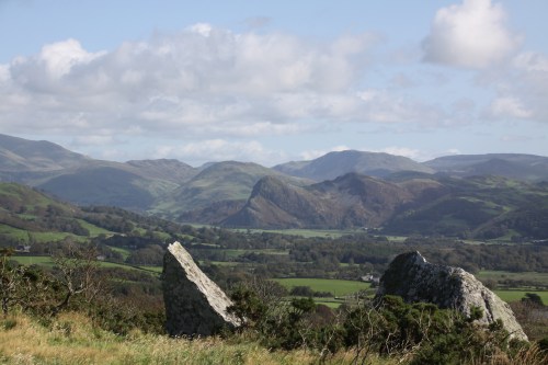The ridge at the left of the photograph, at the end of the Dysynni valley is Mynydd Garreg. Llechlwyd and Tal y Garreg hillforts are at the coastal end, and Castell Mawr at the opposite end of the ridge. Bwlch is also visible at far right. Views from Craig yr Aderyn