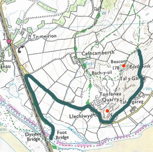 • Via the fortlet at Brithdir towards Tomen y mur (to the northeast of Llyn Trawsfynydd. Tomen y Mur is considered to have been the most important Gwynedd fort due to its strategic position, its size and its complex layout, with an amphitheatre, bath house, vicus, mansio and related structures, including a possible aqueduct.  Although the roads connecting it are not completely mapped, it is clear that it was an important link between mid (and south) Wales with the important sites of Caernarfon and Canovium (Caerbun) to the north, which were in turn connected to the regional capital at Chester.