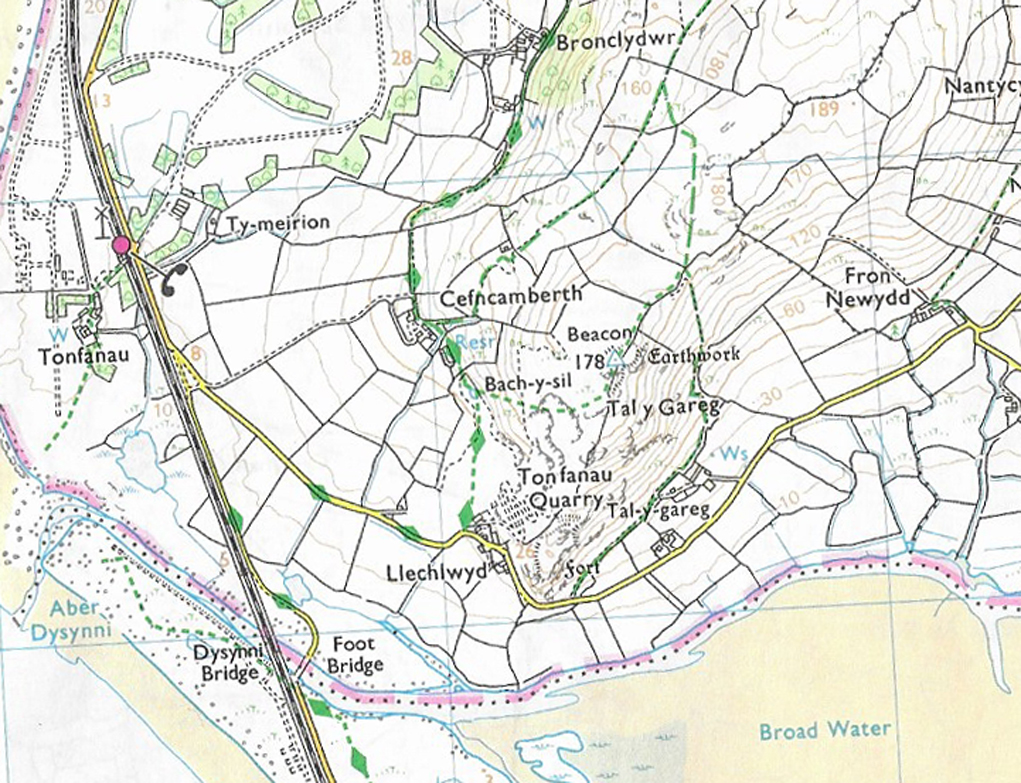 There are no hillforts in sight to the south or east, just the immediate hillside.  The nearest hillfort to the south, also on a hill overlooking the coast but out of line of sight from Castell y Gaer, is Bwlch on Foel Llynfandigaid, which is around 4km away as the crow flies but a range of higher ground stands between them. A perusal of the Ordnance Survey map produced the site of Dinas Oleu, which sits immediately above Barmouth at SH61711578 and turns out to be the remains of an Iron Age hillfort (approachable via a footpath and there are a few details about it on the Coflein website).  The two sites are around 7km apart as the crow flies, and it would require a very clear day or night for any signals to be visible, not always a foregone conclusion in a coastal/estuary location.  The arrow in the above photograph is a guess, based on trying to match up the photograph with the OS map, and should be treated as extremely approximate.  The lack of a line of sight to the sites to the south does not rule out that Castell y Gaer had an important role linking north and south along the coast.