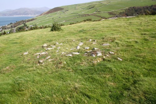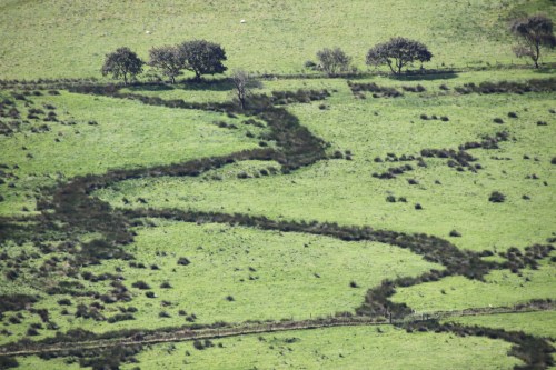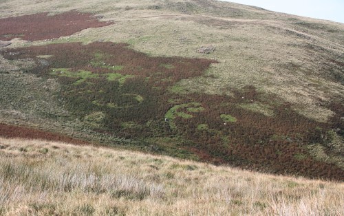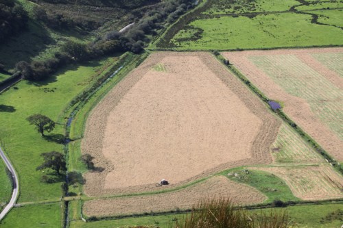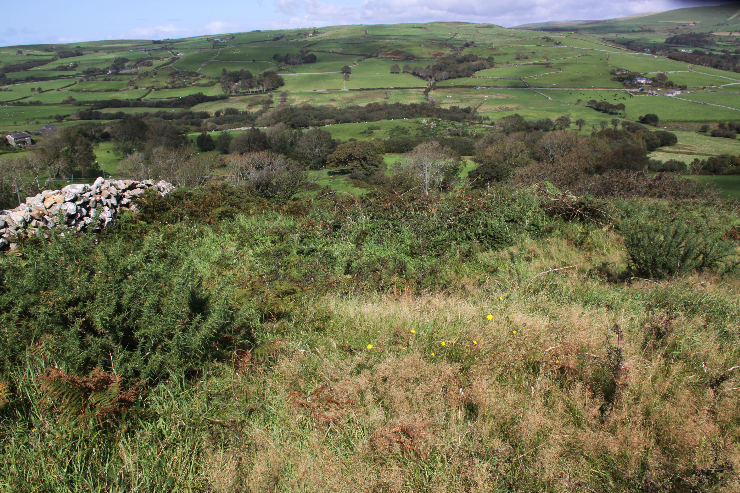 The Coflein website says that the interior of the enclosure shows signs of cultivation and that a rectangular enclosure/platform, c.20m square, to the northeast may be connected.  It also records that there are extensive traces of relict fields occur to the west, although it does not comment on dating, although the close association between the fields and the hillfort makes a direct association possible.  The fields are visible on the photograph below,