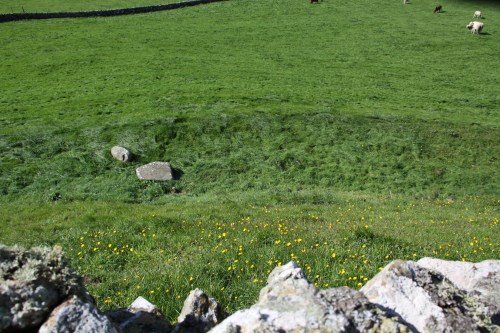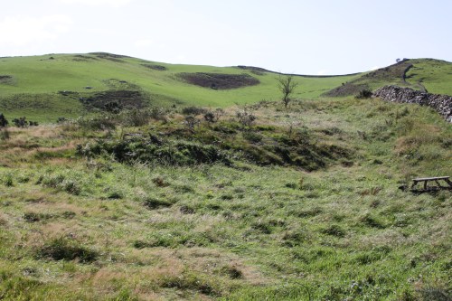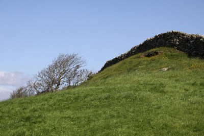 In the second phase an additional line of banks and ditches were built on the eastern side to enclose a larger area of approximately 1.6 hectares, measuring 119 by 170m (390 x 560ft) on the east side, which was most vulnerable to attack. This included a substantial stone wall, much more impressive than the first phase.  Unfortunately, this has now collapsed, but its original line is still clearly visible.  Secondary improvements were a wall on the south side and two new banks to the east.  These were accompanied by another in-turned entrance, this a lot more prominent and well built than in phase 1.  Unlike the first entrance it could only be approached via a steep slope.  This is the entrance that the public footpath uses today, but even if you approach the hillfort at a tangent and follow a sheep track into the interior, the entrance is unmistakable from the interior.