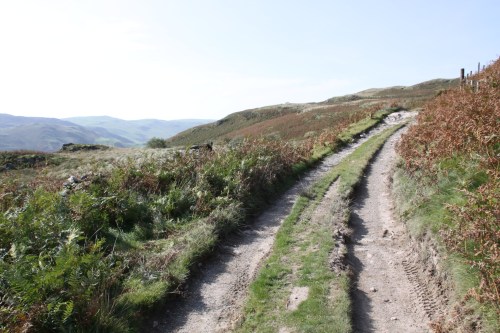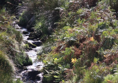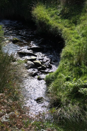 It’s an easy walk if you have good footwear, with a good track and no very steep gradients.  It should also be avoided in wet weather, or at least go in heavy duty footwear.  It had been very dry for the previous week, but we still ended up having to walk off the path in certain places as it was swamped with mud, and was often marshy either side of the path.  There were several points at which we had to ford fairly wide streams, two of which are marked on the map as fords. It was very windy even on a sunny day, so head gear would be a sensible precaution.  The only cloud on the horizon was that at weekends it is used by trial bikers, travelling at speed, with precious little care for any walkers who might be round the next corner.  Thanks to the noisy engines, you can hear them coming and get out of the way, but I recommend that you avoid walking there at weekends.