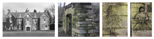 Finally, there are two puzzling carvings flanking the last surviving remnant of the north wing, its porch, shown in the image below. The one on the right is still well preserved, but although there was also one on the left this is now very difficult to make out. I have seen no suggestions about when they were added or what they were supposed to signify.