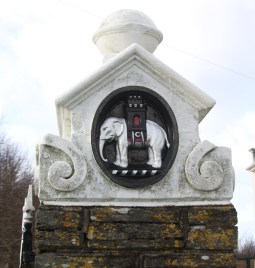 One of the twin gateposts of the Ynysymaengwyn Estate today, with part of John Corbett’s coat of arms
