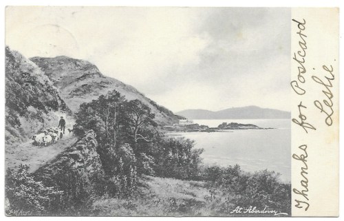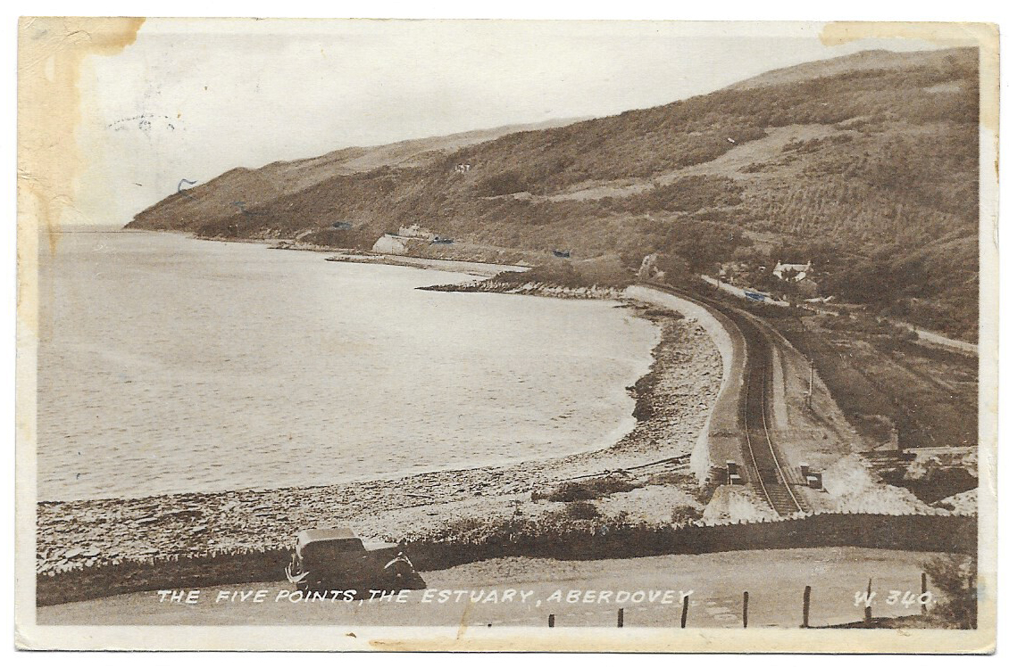 This postcard shows the River Dyfi at Frongoch where it widens into the estuary, with the five small promontories known as Five Points.  The viewpoint is on the road from Machynlleth to Aberdovey just above the Frongoch boatyard, and just around a particularly nasty bend. In the postcard, there’s a lovely vehicle in the foreground, and the railway is ever-present.  The wall between the road and the modern boatyard at Smuggler’s Cove below doesn’t seem to have changed much since the postcard photograph was taken, but the foreshore in the first cove has expanded out into the estuary.  Dated 5th August 1950, the card was sent to an address in Greenford in Middlesex, and has an Aberdovey-Merioneth postmark.
