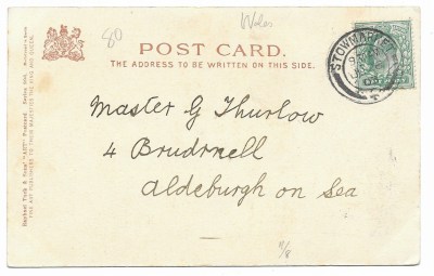 The stamp shows Edward VII who reigned from 1902-1910, and this particular shade of blue-green was issued between 1902 and 1904.  The stamp is postmarked Stowmarket and is dated 9.30AM, June 26th 1903.  Perhaps the purchaser bought it in Aberdovey and took it home to post.