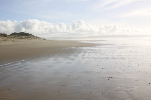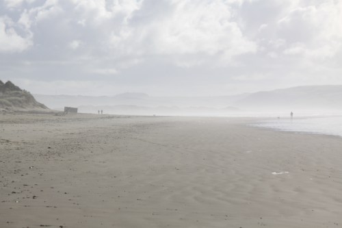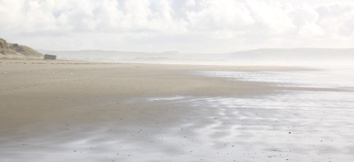 Yesterday’s walk along the beach was extraordinary. I had intended to park by the cemetery, but by accident parked opposite the row of houses at the foot of the road from the Trefeddian Hotel, crossed the golf course and emerged from the dunes at the Second World War pillbox. The sun was hazy and incredibly pale, but at the same time reflected off the wet sand, creating some beautiful colour and light combinations. I walked for far longer than intended, and it nearly became a case of walking into Tywyn and getting a bus or taxi back to my car! Instead I retraced my steps, and because of the light it was like doing an entirely different walk. It was lovely to see a pair of oyster catchers, obstinately refusing to do anything other than stand, preening in the sun! They are in the video at the end of this post.