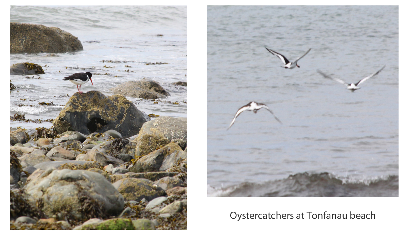 After walking up Tonfanau to see the Iron Age hillfort I went along the road to Tonfanau station, crossed the tracks and passed part of the old military camp to go down to the pebble beach. It is an excellent place for watching the oyster catchers, and I was lucky to find some pottering around at the water’s edge, amongst the small rocks. Oystercatchers are lovely to look at. Their bright orange beak and pink legs make them stand out from any background, whilst their black and white plumage is particularly distinctive when the birds are in flight. They make a piercing peeping sound, which can be heard here on the British Birdsongs website. Oystercatchers feed on molluscs that the find on rocky shorelines, which they open by stabbing the sharp beak through linking muscles, and then hitting on stones and rocks to break them up, sometimes audibly. The video below shows a pair of them on the beach at Tonfanau. Duration: 1 minute, 33 seconds.
