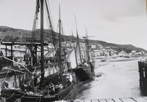 The schooner nearest to the camera is called Adventure.  She is not mentioned in Lewis Lloyd’s book so she was probably not built at Aberdovey but, like the Ellen Beatrice, discussed on a previous post, was probably a coaster that visited various ports on the Welsh coast.  The Crew List website lists over 40 vessels named Adventure between 1857 and 1940, but none of those clustering around the mid to late 19th Century seem to fit the bill.  I’ll continue to look into it, and update the post when I have more information.