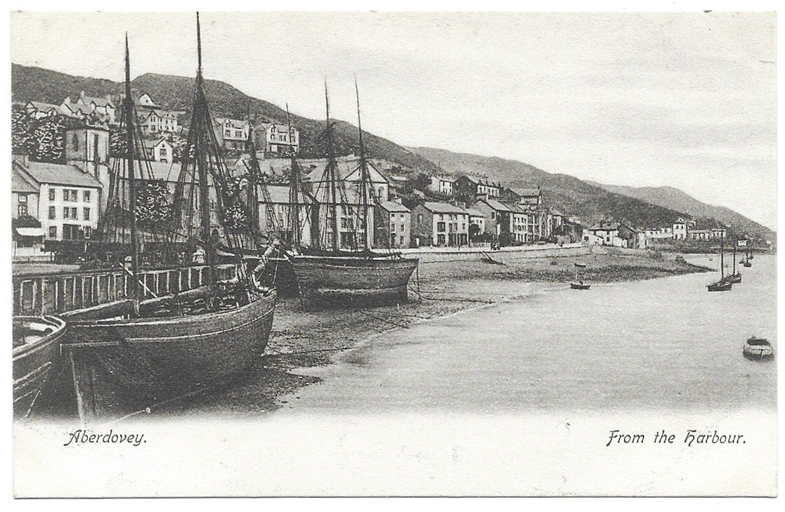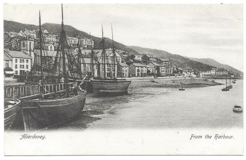 Two lovely postcards showing sailing vessels at Aberdovey, moored against the wharf.  I have no information about either.  The names of the vessels are not visible and there is no information on the postcards themselves, not even a postcard manufacturer name.  As to a date, the postcards post-date the building of the wharf and jetty in 1885 and predate the conversion of the Pen Y Bryn chapel into a school inn 1894.