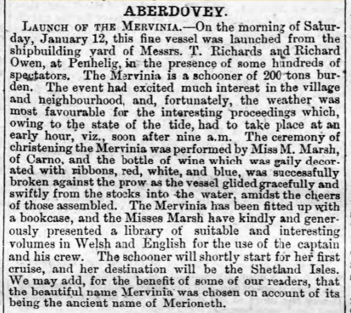 The launch of Mervinia on 15th January 1878 was covered in the Cambrian News and Merionethshire Standard:  “The event had excited much interest in the village and neighbourhood and, fortunately the weather was most favourable for the interesting proceedings which, owing to the state of the tide, had to take place at an early hour, viz., soon after nine a.m.”  Fortunately the bottle of wine used by Miss M. Marsh of Carno to launch the ship by breaking it against the hull duly smashed – an unbroken bottle was a very bad omen.  The bottle was “gaily decorated with ribbons” of red, white and blue, and must have looked very celebratory.  The crowd cheered as the ship glided into the water.  The newspaper report goes on to say that “the Misses Marsh” contributed books in Welsh and English for the bookcase that had been fitted on the ship, for the use of the captain and crew.