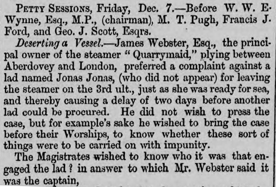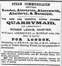 The steamer started on her first voyage to London on Saturday.  Several of the owners and gentlemen were on board.  Also some ladies who went as far as Aberystwyth.  Robert Davies Jones, Esq., Trefi, and Lady R. Webster, Esq., Aberdovey etc, were on board.  The Quarrymaid steamed beautifully out of the harbour and made about nine knots an hour.