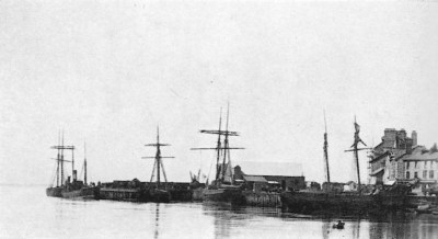 All three vessels are beached on the sand at low tide.  If you click on the image to enlarge it and look behind the ships and you can see the rails that ran along the wharf, with some trucks in situ, with a man sitting on one at far left of the shot, and a linkage between the truck and Adventure.   There is a mobile gantry next to the trucks, which would have been shifted along the tracks to assist with the loading and unloading of ships.  I haven’t seen the gantry in other photographs.  Beyond the trucks are what appear to be sails drying.  On the whole, this wonderful photograph poses more questions than it answers.