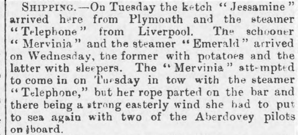 An interesting article in the Cambrian News and Merionethshire Standard dating to two years previous to the withdrawal of Dora from Aberdovey concerns the withdrawal of Telephone from Aberaeron, and may reflect some of the concerns that the loss of Dora may have caused.  “Notes from Aberayron” opens with the statement “The most significant of all news for the week” was that s.s. Telephone would no longer connect Aberaeron with Liverpool with its “fairly large cargoes” on a fortnightly basis.  The article says that it has been suspected for some time that the service was running at a loss, and this was now confirmed.