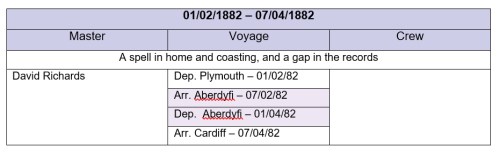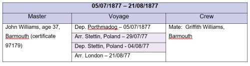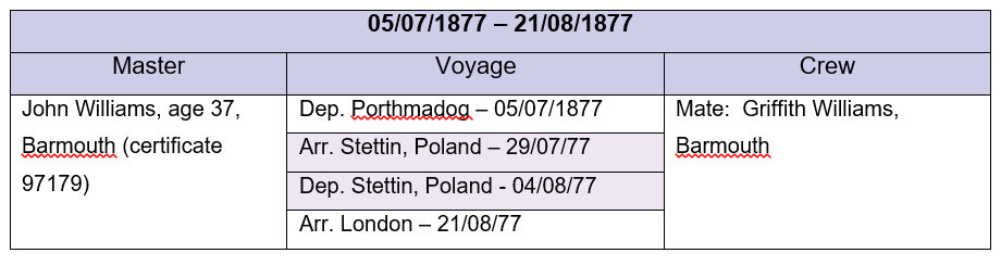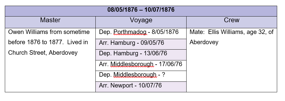 From the day of her launch, her Managing Owner was William Owens of 21 North Parade, Aberystwyth.  Managing Owners were often the business managers for ships, based on land and running the commercial side of things whilst appointing a Master to take the ship concerned to sea.  The further the ship went from her own port, the more complex this relationship.  William Owens, however, seems to combined the roles of Managing Owner and Master himself.  He was listed as the Master of Ellen Beatrice for many of her voyages between 1866 and 1872, with Glyn Botwood usually acting as Mate until 1870, reappearing in 1873.  After 1872, 50-year old William Owens is replaced as Master by Robert Evans, but is listed as Boatswain.  For a few years Owens returned as Master and even when Richard Davies Jones took over for the rest of the 1870s into the 1880s, Owens often acted as Mate, only vanishing from the roster in the 1890s.
