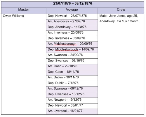 Of the 64 shares, timber merchant Richard Owen of Machylleth had 52 shares and ship owner Morgan Owens of Aberystwyth had 12 who became the ship’s managing owner (responsible for all commercial decisions regarding the ship’s career) in May 1876.   Initially, the ship’s builder Thomas Richards did not have any shares in the ship, although he did have shares in other ships that he owned, including his successful 1878 ship Mervinia, in which he held 10 shares from launch.  Almost immediately Richard Owen sold 24 of his shares between 12th May and 19th May 1876, retaining 28, after which the ownership stood as follows (listed by Lewis Lloyd, 1996):
