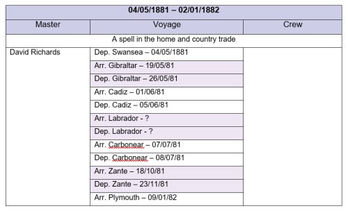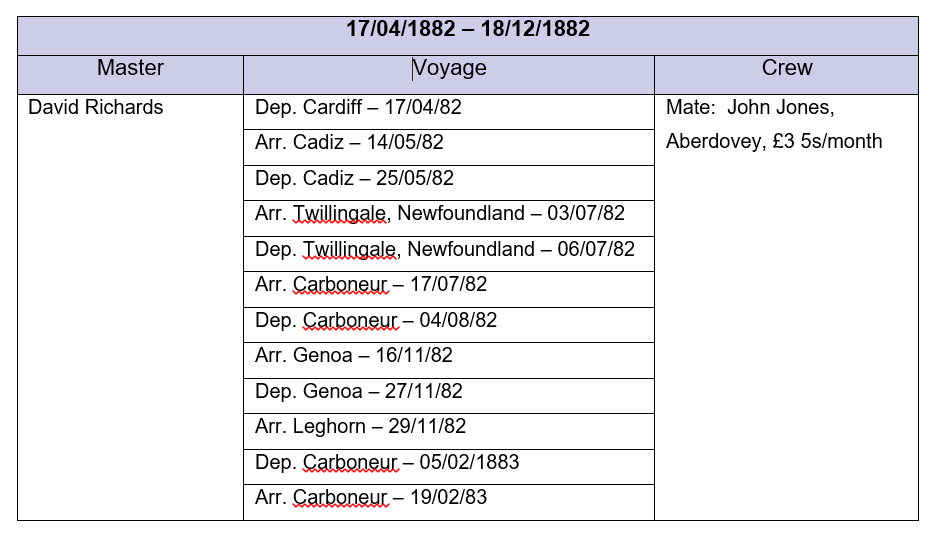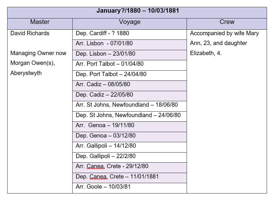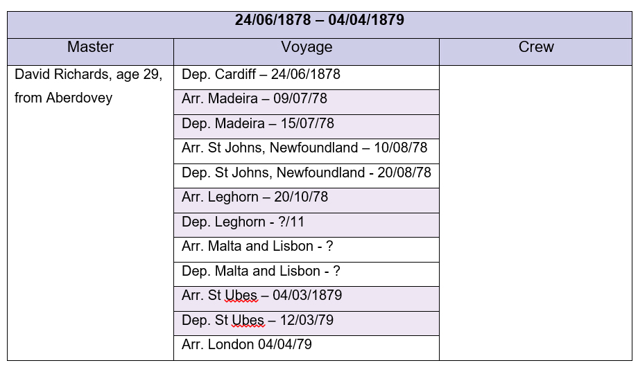 The ship now began to operate on new routes, this time out of Newport in Wales, and again the crew was rearranged, presumably to take advantage of experience in foreign waters.  For a trip from Liverpool to Avila in Spain, returning to Newport between 17th May 1879 and 23rd June 1879, the Master was now Charles Dean Cook of Bristol, aged 57 and John Jones was  boatswain and Purser.  David Jones left the ship.  On her next voyage from Newport to Bilbao and back to Newport (9th July 1879 to 16th August 1879)  John Evans returned as Master, with John Jones remaining as boatswain and purser.  The same arrangement was retained for her next trip from Newport to Alicante and then Runcorn (28th August 1879 to 20th November 1879).  For the rest of 1879, Mervinia returned to the coastal trade, John Jones was reinstated as Master and John Evans was Mate.