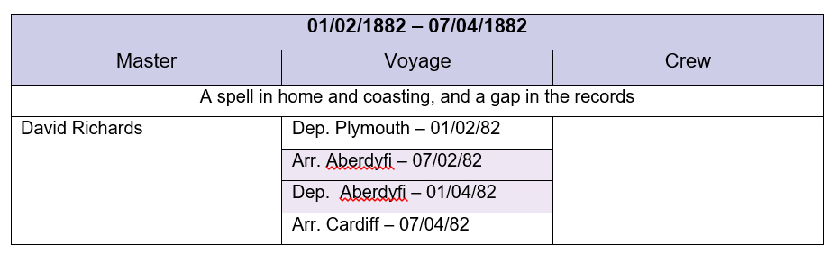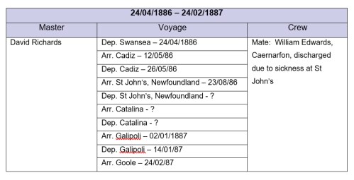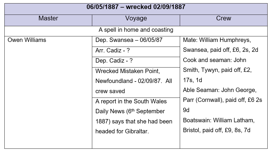 Maglona was initially engaged in local coastal and Baltic trades under Owen Williams of Church Street, Aberdovey and then John Williams of Barmouth, before entering the trans-Atlantic and Mediterranean trades under a Master Mariner David Richards (certificate 97179), who had built up considerable experience in the trans-Atlantic timber trade and, by 1880 was living in a house in Aberdovey called Dovey Villa.  Maglona‘s history seems to be fairly trouble-free until she was wrecked.  The only reference I can find to her on the Welsh Newspapers Online website is in April 1878 when, according to a very brief comment in the South Wales Daily News of 4th April, she arrived at Milford Haven under Captain Owens carrying a cargo of manure, with her foremast mast missing, but there are no further details in this report.  Losing masts was commonplace, if regrettable, and usually occurred in heavy storms.