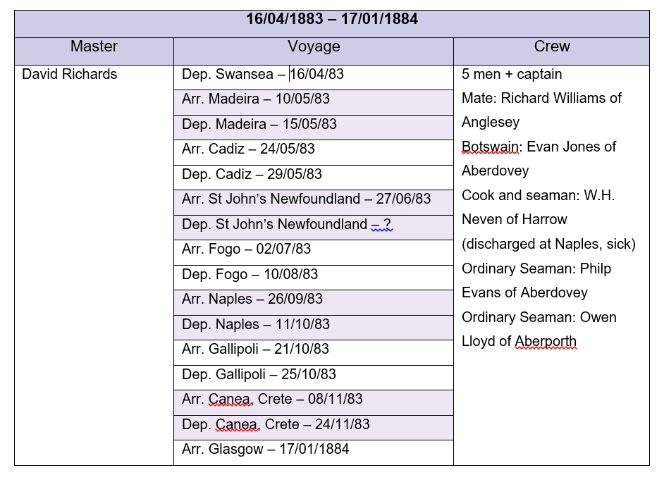 The ship’s various voyages are summarized in Lewis Lloyd’s A Real Little Seaport, volume 1, pages 171-176.  Mervinia operated for at least 12 years after Maglona was wrecked, so the records of the ports she visited are much more extensive.  She called into a remarkable number of foreign ports, apparently becoming a specialist in overseas cargo transport, visiting Portugal, various  Mediterranean destinations, Newfoundland ports (mainly St John’s, Fogo and Twillingate), the Baltic and southern Ireland.  British ports that she visited include Glasgow, Greenock, Grangemouth, Gloucester, Port Talbot, Bristol, Hull, Teignmouth, Newport, Liverpool, Cardiff, Swansea, Parr (Cornwall), Dartmouth, Runcorn, Porthmadog and of course Aberdovey.