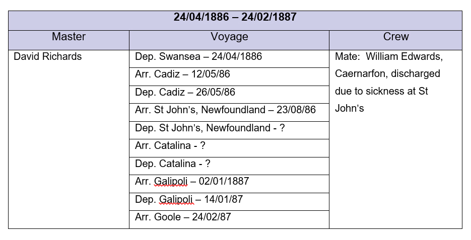 The Mercantile Navy List includes her up until 1924.  During that period she changed hands several times.  Her Managing Owner from 1865 was William Owens who was registered at 21 North Parade, Aberystwyth.  The vessel’s registered tonnage was 88 tons when she was launched, but was changed to 76 tons in 1892.  Between 1902 and 1914, presumably on the death of William Owens, the title and responsibilities of Managing Owner passed to Mrs M. Owens of 41, North Parade, Aberystwyth.  It’s a different address, but she was probably his wife, unmarried sister or daughter.  Between 1915 and 1917 her Managing Agent was Ernest Brown, Tintagel View, Port Isaac.  Between 1918 and 1920 she was in the hands of The Weymouth Diving and Touring Company at 17A King Street, Weymouth.  Finally, between 1921 and 1923 (now registered 73 tons) her Managing Owner was William T Cundy of Lipsom Road, Plymouth.
