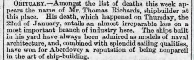 Thomas Richards (1819-1880) was brought up locally, attending school in Bryncrug.  Together with John Jones and Roger Lewis, he was a leading shipbuilder in the Aberdovey/Penhelig area.  His shipyard was somewhere near Penhelig, and although his first ship of 1858 was Elizabeth and Margaret, a 44 ton smack (a traditional fishing boat) he specialized in schooners that were big enough to tackle long distance trade, around and above 100 tons burden. Lloyd comments (p.100) “He was soon recognised as a shipbuilder of quite outstanding ability, as an artist.”  D.W. Morgan says (p.126) that  all of his schooners “sailed and looked like yachts.” He built 14 vessels in 22 years, of which only Elizabeth and Margaret and Olive Branch were not schooners His largest vessel was the 204 ton brig Naomi (brigs had two masts, fore and main, both square-rigged, with a gaff-rigged sail on the main mast). Richards was responsible for Aberdovey’s last sea-going vessel, the 99 ton schooner Olive Branch, but died before her completion.  Shipbuilders all had different approaches to the task.  Lloyd says that John Jones often had many ships on the go at a time, but Thomas Richards preferred to concentrate on one at a time, giving full attention to the job at hand.   He did not live to see Maglona wrecked in 1887, dying in 1880.  His obituary in the Cambrian News and Merionethshire Standard on January 30th 1880 is a measure of the respect in which he was held as a shipbuilder.