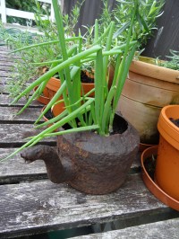 I grow my giant chives from spring onions.  When I buy a bunch of spring onions with the white roots still attached, I cut off about 3cm of the spring onion at the root and put it in water for a couple of days, until the roots start to grow and produce new white tendrils and then stick them in a pot of compost, with the top just sticking out.  Job done.  They start to grow immediately and within a couple of weeks you have a healthy crop – one giant chive per spring onion.  And by giant, I mean that the ones I have out there at the moment, which are about a month old, are now nearly 2ft tall.   The ones shown in this photograph were exactly two weeks old.
