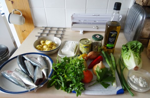 Here’s what I did with the mackerel from Dai’s Shed:  Gutted it, cut slits in it on both sides, rubbed in a mixture of garlic, paprika and olive oil and baked it stuffed with lemon slices in foil painted with olive oil in the oven.  I served it with lemon slices (should have been limes, but I didn’t have any), the juices from the foil poured over the top and a salad made of diced purple onion, mint leaves from my garden, diced salad tomatoes, capers, shredded little gem lettuce, giant chives from the garden, a home made mustard vinaigrette and a good shake each of salt, pepper and piri piri.  Spot the deliberate mistake with the layout of the cutlery 🙂  Couldn’t figure out what was wrong with it until I started trying to eat!