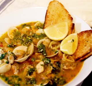 I skinned and cooked some tomatoes, lightly fried onion and garlic in olive oil, sprinkled over a little smoked paprika and whizzed it all up in the food processor.  I added herbs, ground fennel, a seriously good pinch of saffron and a big spoonful of piri-piri for a good hit of heat.  A little fish stock, a little white wine and a small glug of brandy completed the mix.   I sliced the huss into chunks, fried them quickly in olive oil, and then removed them from the pan.  Next, the components of a pack of frozen shellfish from the Chester Waitrose went into the same pan, and those too were removed once they had heated through.  Into the fishy juices I poured the tomato mixture and reduced it down.  The huss went back into the pan first and then the shellfish, all topped with clams in their shells to warm through.  It was accessorized with a fresh coriander gremolata over the top, and served with a grilled slice of crusty Welsh bread with a clove of garlic rubbed over it for dipping in the juices.  A delectable glass of Sancerre to accompany it wrapped things up perfectly.   Not as glamorous or authentic as a French bouillabaisse or as delectable as a Spanish zarzuela, but my simple Algarve-inspired fish stew was a lot quicker to produce and required much less fish!
