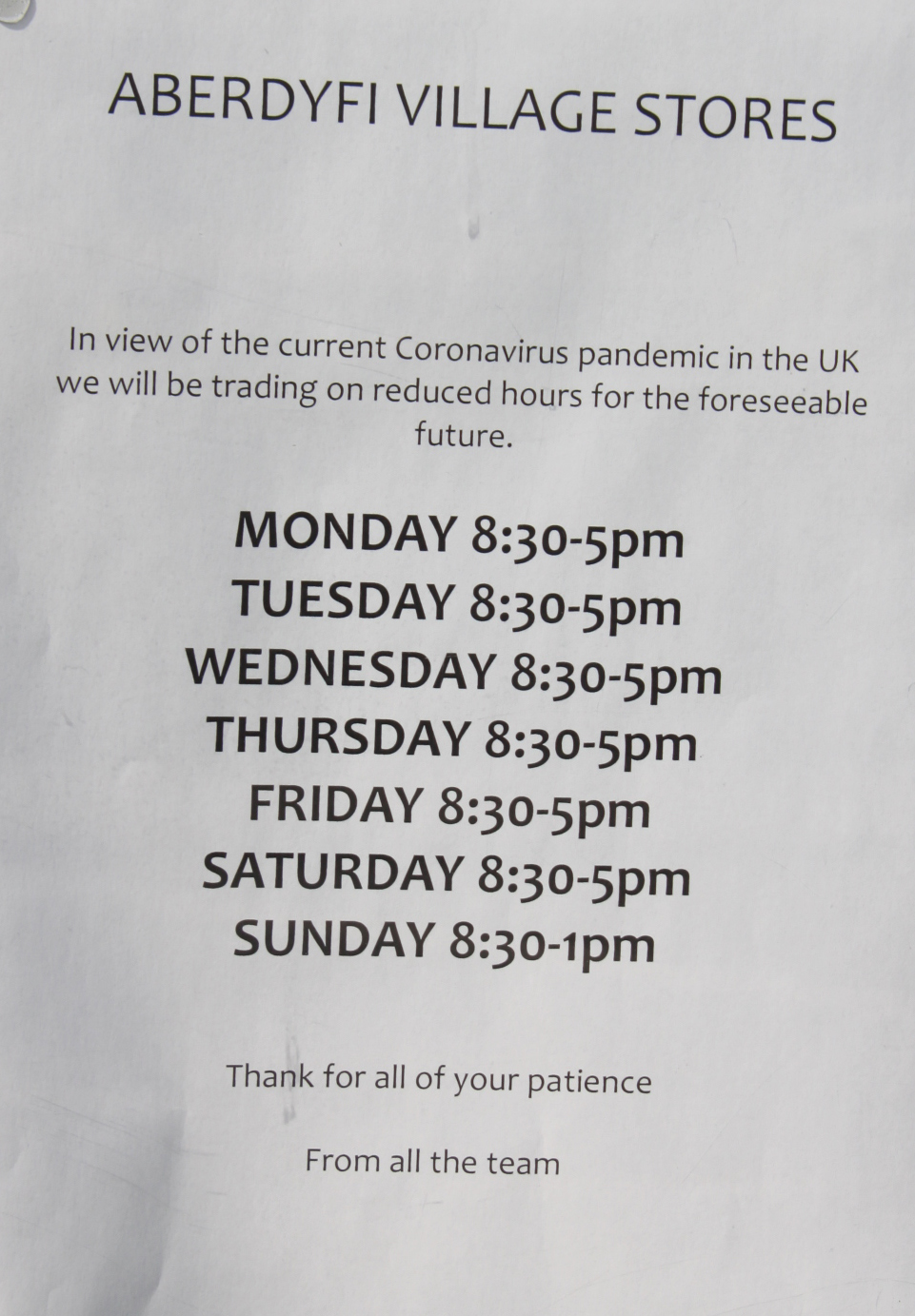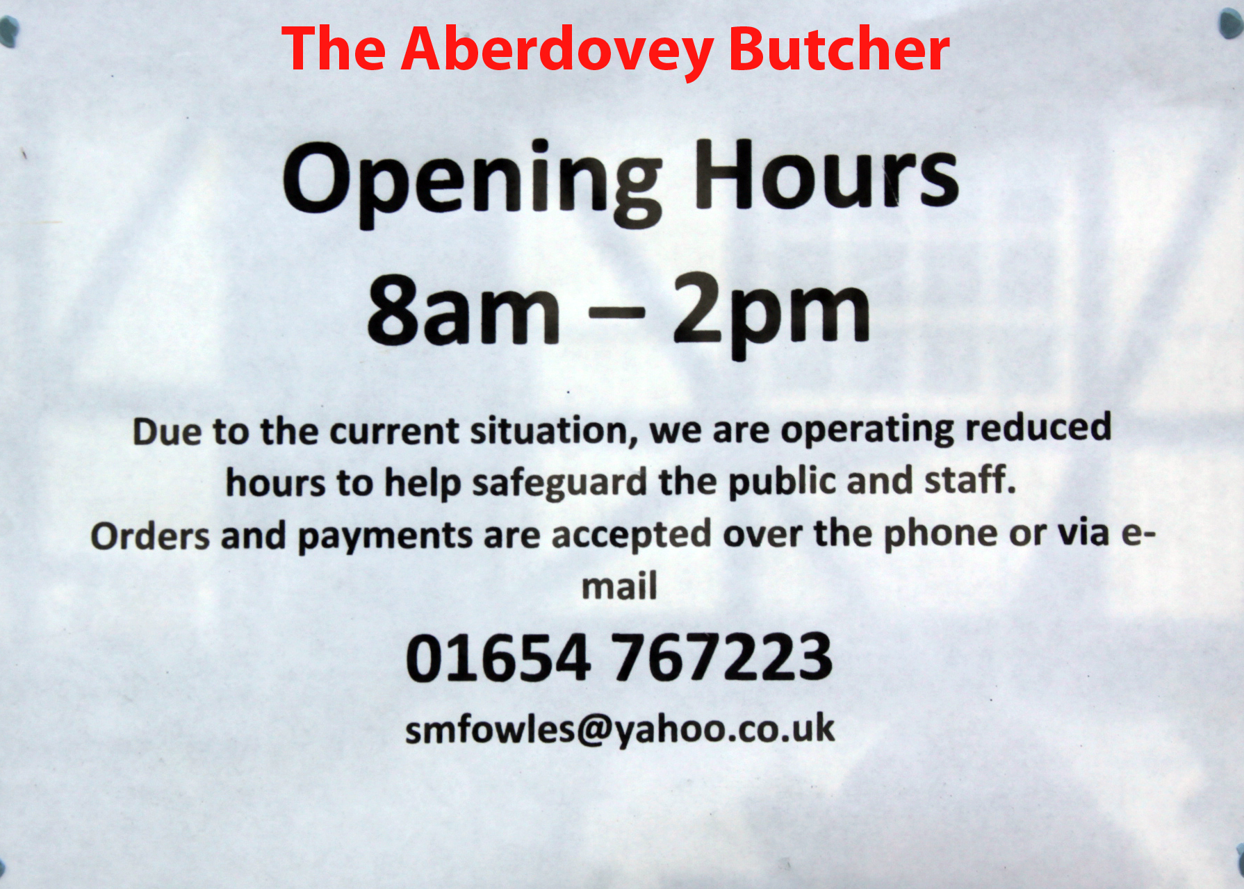 I only went past three food shops today in Aberdovey, and missed the Spar/Post Office, but here are some useful opening times, stuck to their front doors.  Of course they are subject to change.  Many thanks to them for continuing to provide an excellent service during trying times.