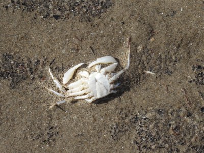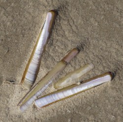 Razor clams were dotted around the beach, but at one point on the beach it was a positive graveyard with dozens of them concentrated in a small area. As far as I could tell they were all of the same type, the straight edged bivalve (double shell) pod razor clam, Enis siliqua, with an outer coating called a periostracum. They live buried, aligned vertically, in the sand of the seabed and feed by extending a tube (siphon) above the sand into the sea to extract nutrients. When the tide is out they burrow into the saturated sand, and retreat further in response to vibration. As they borrow they eject water, which leaves a keyhole shape on the surface. I ate rather a lot of them when on holiday in the Algarve, Portugal, and they are delicious.