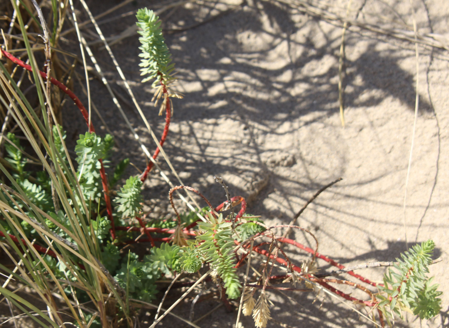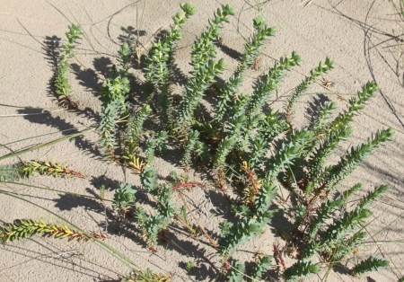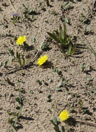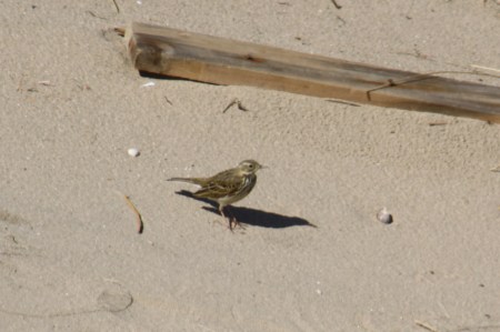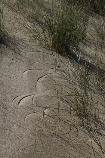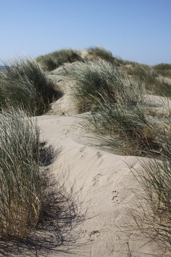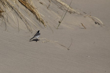 There was nothing much to see on the strandline, which was mainly bladder wrack, leaves and old wood, but the sea itself was absolutely spectacular, and the sky, veering from bright blue to blue-black and back again, provided a wonderful backdrop for both the frothing white waves, the yellowish sand dunes and the bright green golf course. There were good signs of life on the dunes, with brave early plants producing bright new leaves. Not just a feast for the eyes, however, but the ears too. What had originally drawn me to the beach was the thundering roar that announced itself when I opened the front door this morning and on the beach itself it was explosive.